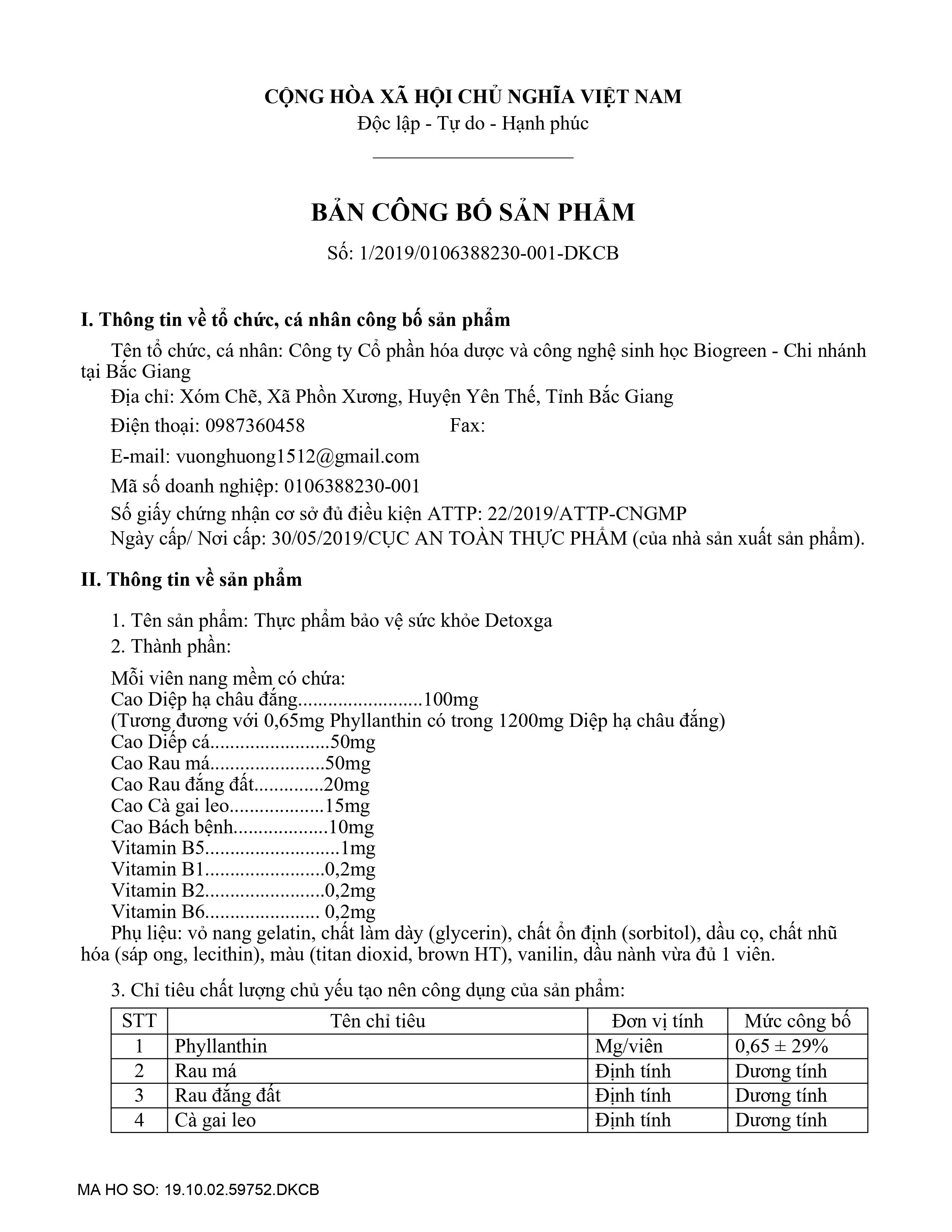 Các dược liệu khác đạt tiêu chuẩn VietGap: Diếp cá, rau má, cà gai leo, bách bệnh Được sản xuất bởi dây truyền hiện đại đạt GMP Công thức sản phẩm toàn diện. ️Thành phần trong Detoxga Mỗi viên nang mềm có chứa: Cao Diệp hạ châu 100mg (Tương đương với 0,65mg Phyllanthin có trong 1200mg Diệp hạ châu) Cao Diếp cá ....50mg Cao Rau má ...50mg Cao Rau đắng đất ....20mg Cao Cà gai leo ....15mg Cao Bách bệnh ....10mg Vitamin B5 ..1mg Vitamin B1 ....0,2mg Vitamin B2 ....0,2mg Vitamin B6 . 0,2mg ️Công dụng: Hỗ trợ thanh nhiệt, giải độc gan, hỗ trợ tăng cường chức năng gan, bảo vệ gan, hạn chế tác hại của bia ruouu, hóa chất ảnh hưởng đến gan. ️Cách dùng: Người lớn: Ngày dùng 2 lần. Mỗi lần dùng 2-3 viên. Trẻ em trên 8 tuổi: Ngày dùng 2 lần. Mỗi lần dùng 1 viên. ️Lưu ý: Thực phẩm này không phải là thuốc, không có tác dụng thay thế thuốc. Không sử dụng cho người có mẫn cảm với bất kỳ thành phần nào của sản phẩm.