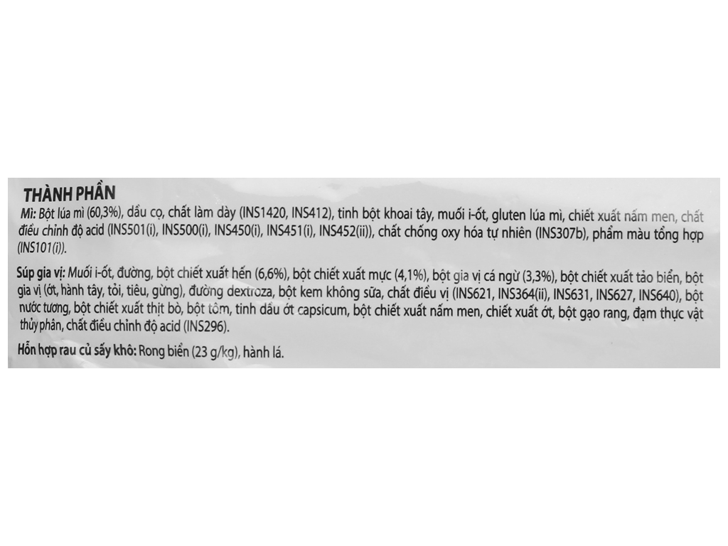 - Mì: Bột lúa mì, chất xử lý bột, dầu cọ, gluten lúa mì, tinh bột khoai tây, muối, canxi, dầu nhũ hoá, chất nhũ hoá,