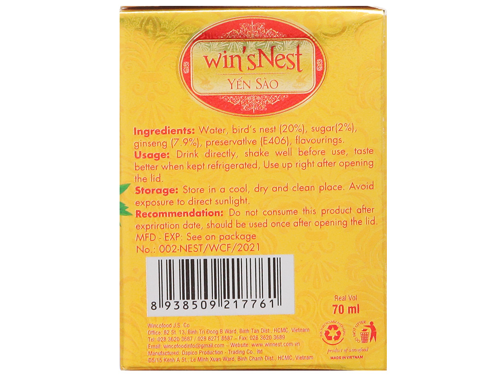 - Yến sào: Hỗ trợ tăng sức đề kháng cho cơ thể, chống lão hóa, ổn định thần kinh, trí nhớ, kích thích tiêu hóa, phục hồi sức khỏe nhanh chóng trong thời gian dưỡng bệnh. Đối tượng sử dụng: thích hợp cho mọi đối tượng đăc biệt trẻ từ 3 tuổi trở lên Sản xuất: Việt Nam Thành phần: Nước, , Yến sào (25%), đường phèn (4%) , chất ổn định (E406), hương liệu dùng cho thực phẩm. Cách dùng: - Lắc nhẹ trước khi uống, ngon hơn khi uống lạnh, tránh đun nóng sản phẩm trước khi sử dụng. - Uống trực tiếp từ lọ. --Uống từ 1 - 2 lọ/ngày. Sản phẩm thích hợp cho người lớn tăng sức đề kháng giúp cơ thể khỏe mạnh, phục hồi sức khỏe cho người bệnh, Không sử dụng sản phẩm khi hết hạn, nên sử dụng một lần sau khi mở nắp.