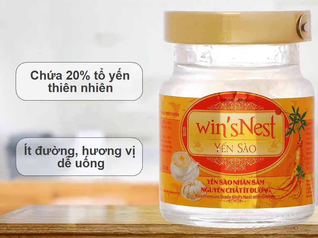 Yến sào cao cấp win'sNest tổ yến chưng sẵn nhân sâm ít đường được sản xuất từ nguồn yến đảo thiên nhiên, là một sản phẩm của công ty wincofood. Được sản xuất bằng phương pháp cổ truyền trên dây chuyền đạt tiểu chuẩn an toàn thực phẩm.