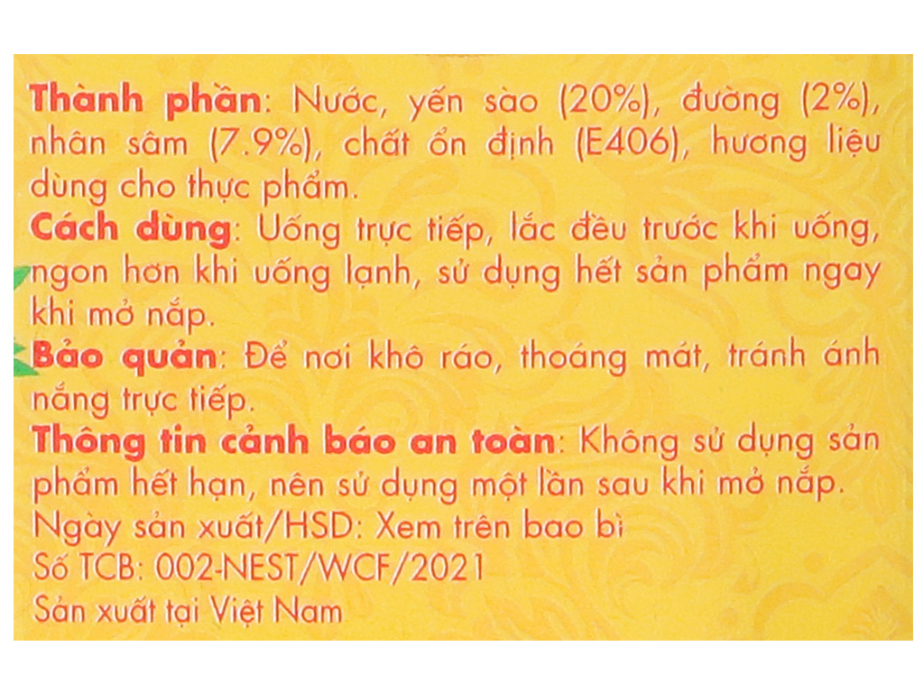 Thành phần: Nước, yến sào (20%), đường (2%), nhân sâm (7.9%) chất ổn định (E406), hương liệu dùng cho thực phẩm.