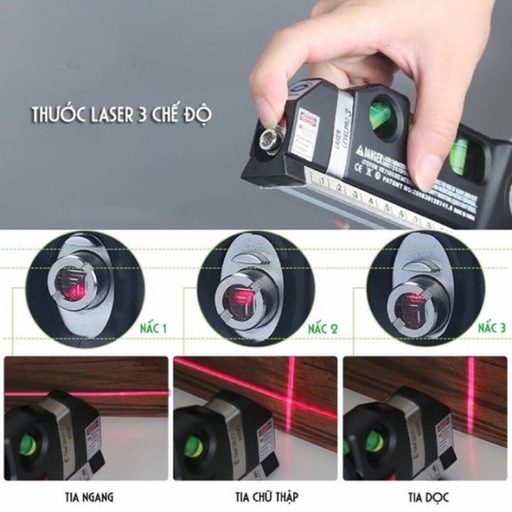 - Chức năng cân bằng, lấy mức Laser, vạch đường thẳng ngang dọc và căn vuông góc; giúp bạn dễ dàng lấy các điểm thẳng hàng hoặc đánh dấu các vị trí sao cho thẳng hàng Với công tắc thay đổi chế độ tia Laser ngang, dọc, và 2 tia cắt vuông góc.