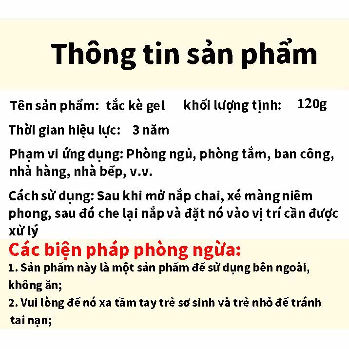 Tên sản phẩm: Gel Đuổi Thằn Lằn Quy cách: 120g Hạn sử dụng: 3 năm khi chưa mở, 180 ngày sau khi mở nắp. Thành phần: Tinh dầu long não, tinh dầu bạc hà và