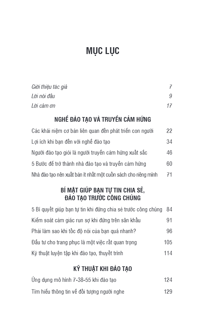 Cuốn sách này sẽ cung cấp cho độc giả các kỹ năng đào tạo và nghệ thuật truyền cảm hứng. Giúp những người đang muốn phát triển bản thân có năng lực thuyết trình và đào tạo, tăng cơ hội trong công việc.
