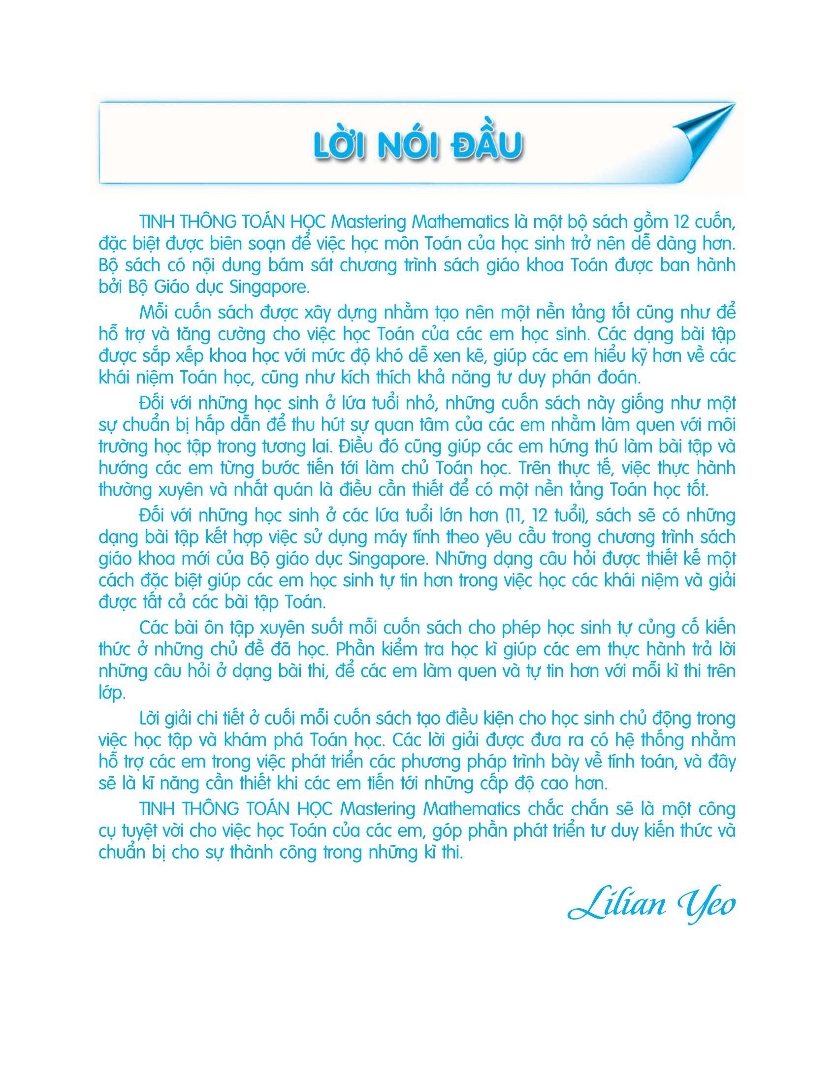 TINH THÔNG TOÁN HỌC Mastering Mathematics là một bộ sách gồm 12 cuốn, đặc biệt được biên soạn để việc học môn Toán của học sinh trở nên dễ dàng hơn. Bộ sách có nội dung bám sát chương trình sách giáo khoa Toán được ban hành bởi Bộ Giáo dục Singapore.