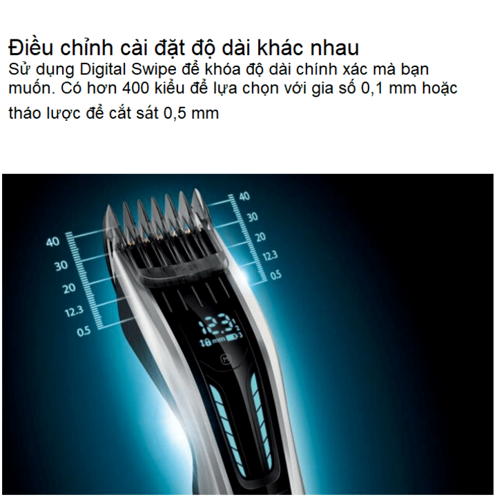 - Màn hình kỹ thuật số của máy cho bạn biết thông tin về chiều dài của cữ lược đang sử dụng, giúp bạn điều chỉnh được hơn 400 độ dài khác nhau của cữ lược, bạn có thể thay đổi chiều dài ở mức thấp nhất là 0,1 mm