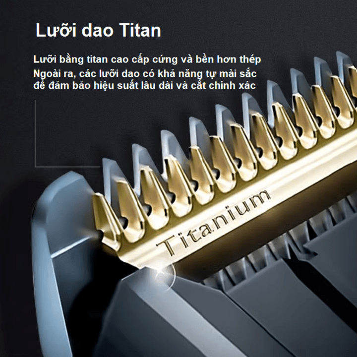 - Lưỡi titan tự mài để tăng độ bền 120 phút sử dụng không dây sau 1h sạc