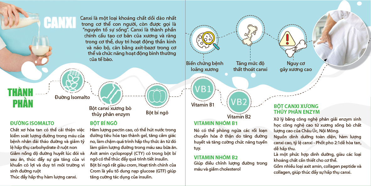 Thành phần chính: Bột chiết xuất bí ngô 1.7g, bột xương (chiết xuất từ xương bò) 1.6g trong đó chứa 475mg canxi, bột cacao 0.2g, vitamin D 0.003mg. Phụ liệu: Sữa bột gầy, polydextrose, isomaltooligosaccharide, maltodextrin, aspartame, ethyl maltol, vanillin, hương sữa vừa đủ 1 gói