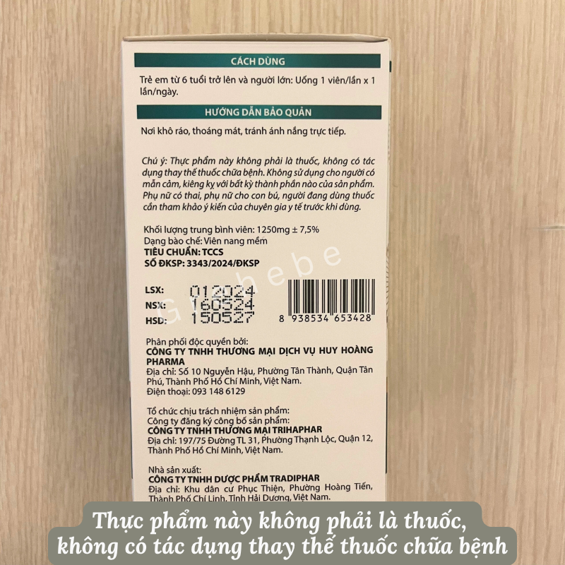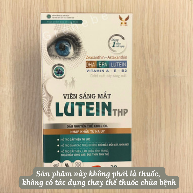 Lutein THP có chứa dầu cá, DHA, dầu gấc, lutein, chiết xuất cây sáng mắt,… hỗ trợ cải thiện thị lực; hỗ trợ giảm các triệu chứng: khô mắt, nhìn mờ, mỏi mắt.   TRONG SẢN PHẨM LUTEIN THP CÓ CHỨA CÁC THÀNH PHẦN: Trong 1 viên nang mềm có chứa: – Dầu cá (có chứa 150mg Omega 3, trong đó DHA 60mg, EPA 90mg): 500mg; – Dầu gấc: 100mg; – Cao việt quất: 100mg – Chiết xuất cây sáng mắt: 100mg – Lutein 20%: 20mg – Vitamin E: 20 IU – Dầu nhuyễn thể Krill oil (có chứa 3,3mg Omega 3, trong đó DHA 0,83mg, EPA 8mg): 15mg – Zeaxanthin 20%: 10mg; – Choline bitartrate: 10mg; – Kẽm gluconate: 10mg; – Chondroitin sulfate 80%: 5mg; – Astaxanthin 5%: 2mg; – Vitamin B2 (Riboflavin): 1mg; – Vitamin A (Retinyl palmitat): 1000 IU; – Selenium yeast 0,2%: 10mcg. – Phụ liệu: chất tạo vỏ nang (Gelatin), chất làm ẩm (glycerin, sorbitol), chất nhũ hóa (dầu đậu nành, sáp ong, dầu cọ, lecithin), chất bảo quản (nipagin, nipasol), hương liệu tổng hợp (Ethyl vanillin), chất tạo màu tổng hợp (titan dioxyd, Ponceau 4R), nước tinh khiết. (Tỷ lệ cao, chiết xuất/thảo mộc thô: 1/10). SẢN PHẨM LUTEIN THP: – Hỗ trợ cải thiện thị lực. – Hỗ trợ giảm các triệu chứng: khô mắt, nhìn mờ, mỏi mắt. – Hỗ trợ cải thiện, làm chậm tình trạng thoái hóa võng mạc, đục thủy tinh thể. SẢN PHẨM LUTEIN THP SỬ DỤNG CHO: – Trẻ em từ 6 tuổi trở lên và người lớn thị lực giảm, cần chăm sóc cải thiện sức khỏe mắt. CÁCH SỬ DỤNG LUTEIN THP: – Trẻ em từ 6 tuổi trở lên và người lớn: Uống 1 viên/lần x 1 lần/ ngày. Lưu ý: – Thực phẩm này không phải là thuốc và không có tác dụng thay thế thuốc chữa bệnh. – Không sử dụng cho người mẫn cảm, kiêng kỵ với bất kì thành phần nào của sản phẩm. – Phụ nữ có thai, phụ nữ cho con bú, người đang dùng thuốc cần tham khảo ý kiến của chuyên gia y tế trước khi dùng.