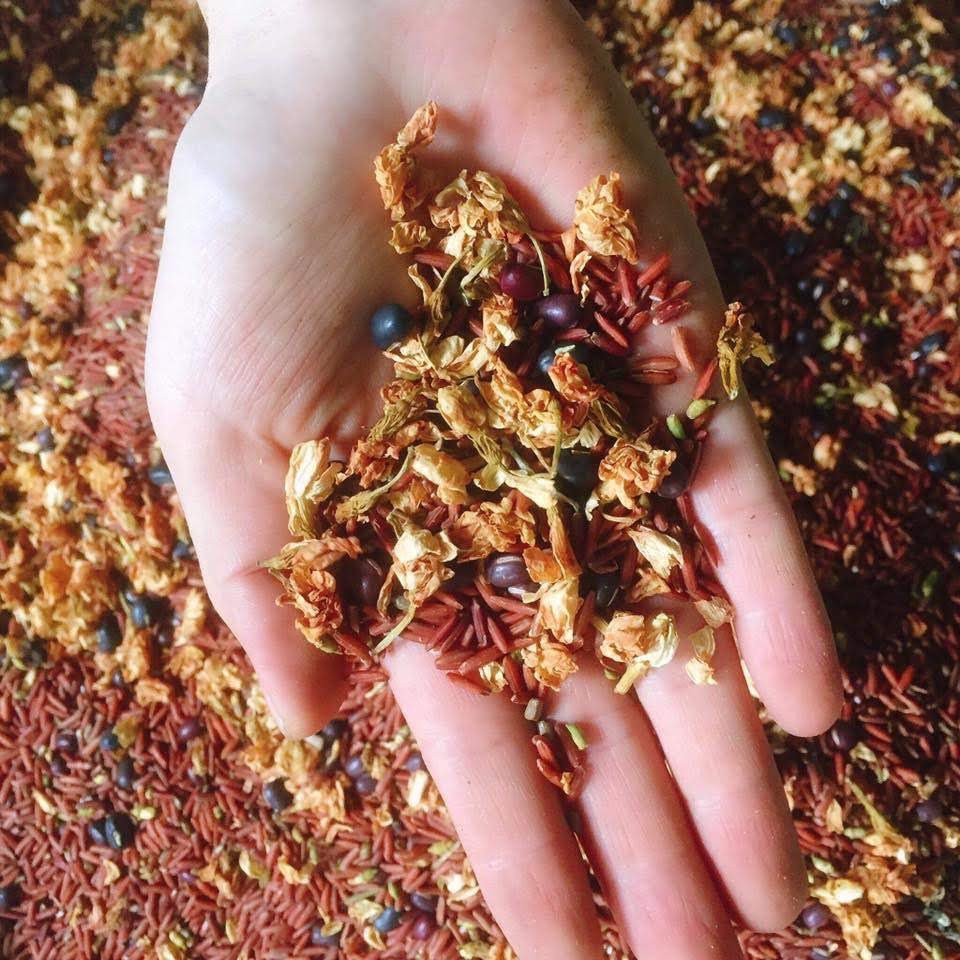 Thành phần: gạo lứt huyết rồng ,đậu đen xanh lòng, đậu đỏ, đậu xanh, thảo quyết minh ,hoa hoè, hoa lài, lá dứa