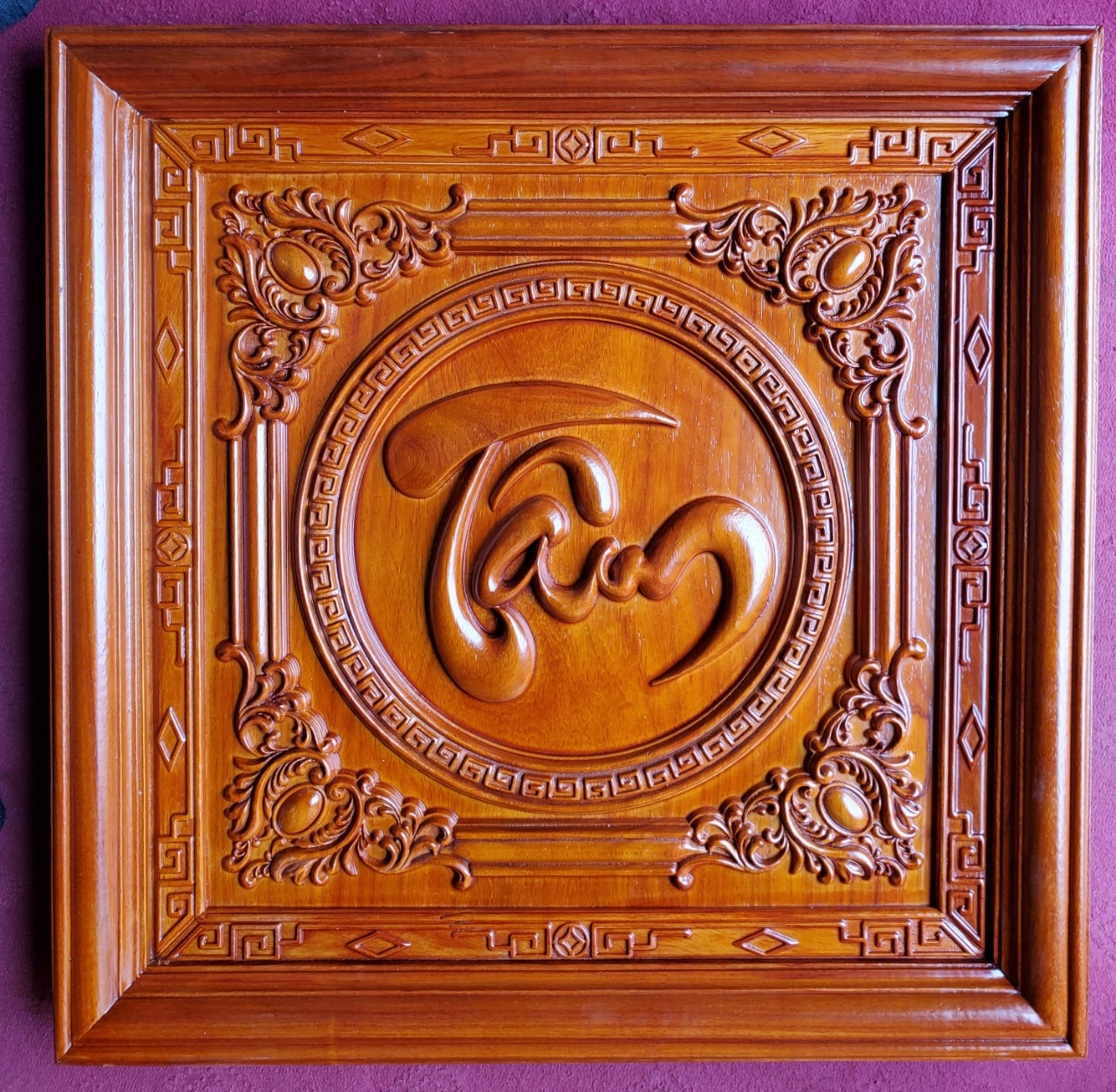 _ Tranh chữ phúc khắc nổi được làm bằng chất liệu gỗ hương đá tự nhiên 100% _ Kt mặt vuông 61×61cm ,ván dầy 3cm khung 4cm _ Tranh được chạm khắc tỉ mỉ ,tinh