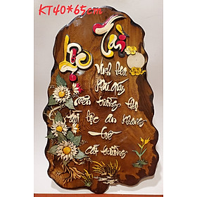 Tranh gỗ thư pháp Chất liệu tranh được cắt ghép thủ công từ nhiều loại gỗ quý tự nhiên tạo lên bức tranh thư pháp rất nghệ thuật. Kích thước tranh ghi trên ảnh