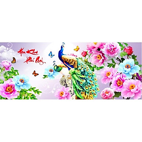 Tên tranh: Tranh thêu hoa khai phú quý con công LV3192 Kích thước: 93 × 43 cm. Thể loại: Tranh thêu chữ thập - sản phẩm này là tranh chưa thêu. Vị trí khách cần
