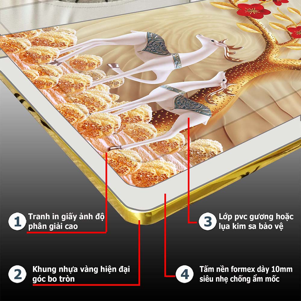 - CHẤT LIỆU VÀ CÔNG NGHỆ IN: Sau khi tranh được in bằng giấy ảnh độ phân giải cao sẽ được cán nhiệt lớp bảo vệ hình ảnh gồm 2 lựa chọn chất liệu: a. Pvc gương có tính chất bóng, phản chiếu ánh sáng và trong suốt. b. Lụa kim sa có tính chất kim tuyến với những hạt mịn lấp lánh trước ánh sáng. Tranh sẽ được in trên giấy ảnh sau đó bề mặt được cán nhiệt bằng một lớp bảo vệ PVC laminator chuyên dụng có tác dụng chống trầy sước, chống bám bụi, trong suốt và có tính chất phản quang, phản chiếu ánh sáông nghệ in Mỹ với hệ màu chuẩn gồm 6 màu C, M, Y, K, L, M. Chất lượng in UV. Phương pháp in phun trực tiếp lên bề mặt của vật liệu bằng mực in UV cao cấp, sau đó được sấy khô ngay lập tức bằng hệ thống đèn UV cho hiệu suất cao, đảm bảo độ sắc nét cho hình ảnh. 2.CẤU TẠO TRANH: