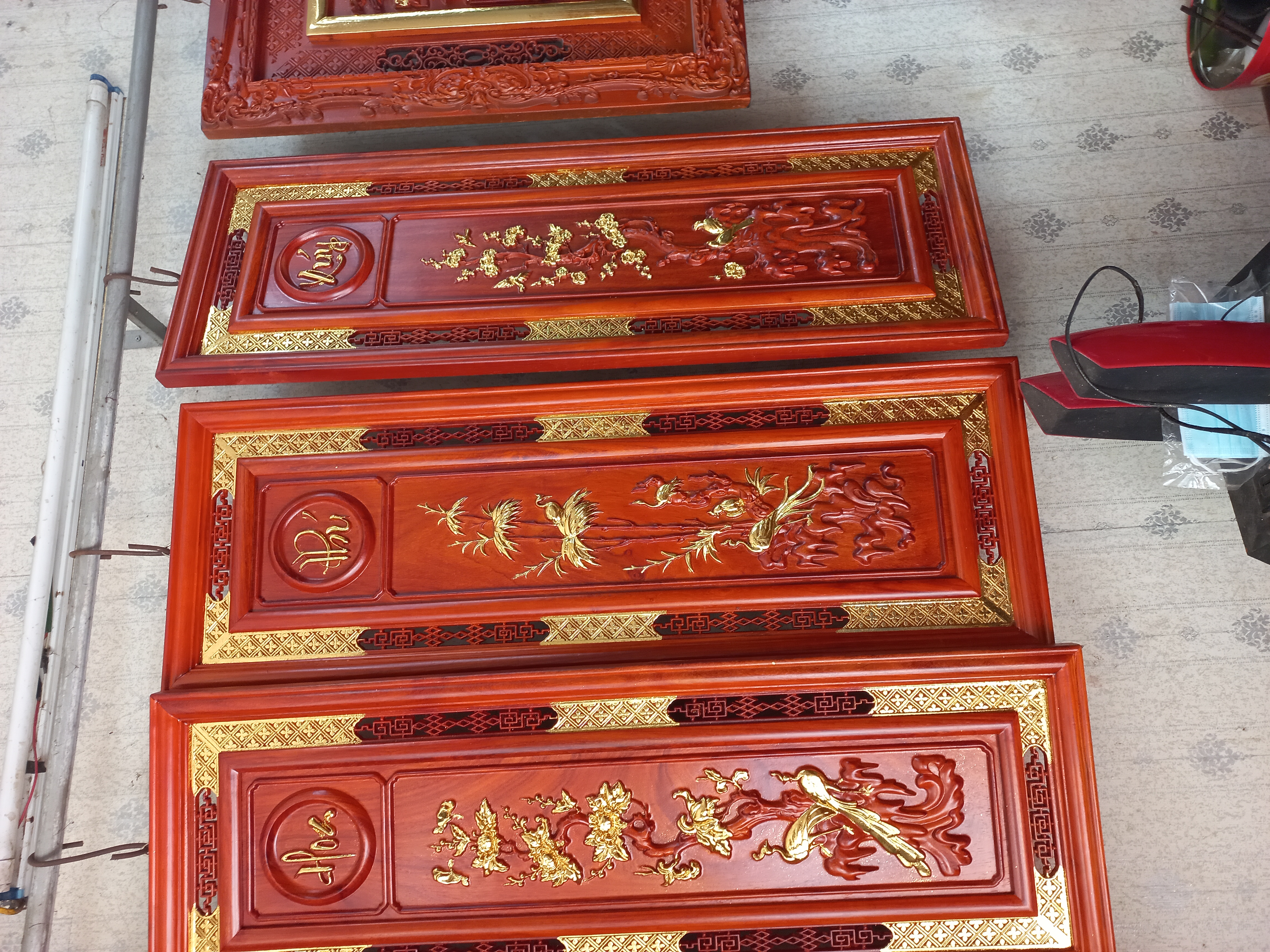 _ Tranh tứ quý bốn mùa xuân hạ thu đông được làm bằng chât liệu gỗ hương đỏ man phi tự nhiên 100% ,Và được sơn pu dát vàng cao cấp _ Kích thước 37×107×