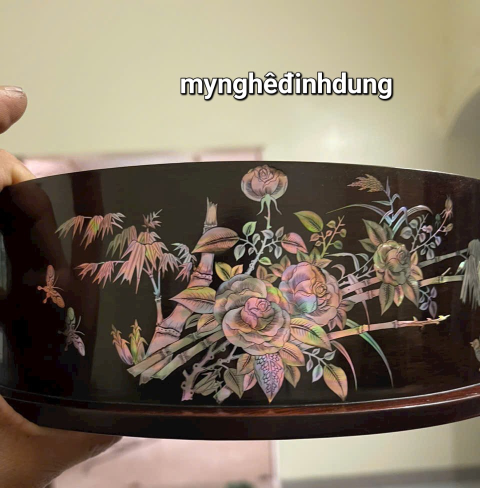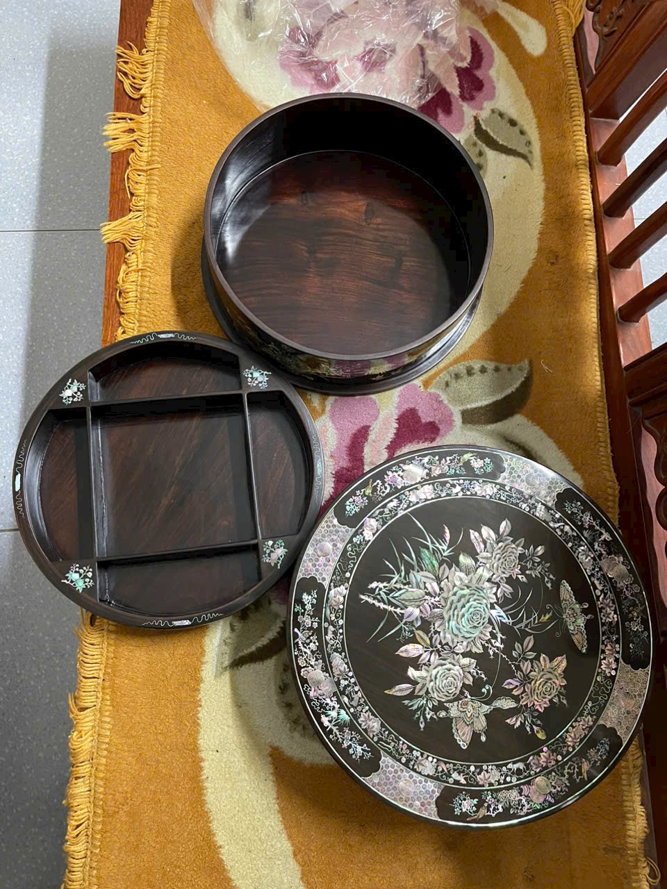 ✨Tráp tròn gỗ trắc khảm ốc đỏ kt mặt tròn 30 cao 11.6cm