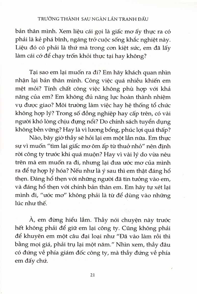 “Cuốn sách này được viết cho bạn - người đang chao đảo bên ngưỡng cửa trưởng thành. Tôi trưởng thành sớm hơn bạn một chút, đôi khi vẫn còn hành xử chưa ra dáng người lớn lắm, tôi viết cuốn sách này để ‘lắng nghe’ câu chuyện của bạn. Hẳn bạn sẽ lấy làm lạ, sách là phương tiện để ‘nói’, vậy mà tôi lại muốn thông qua sách để ‘lắng nghe’? Đúng vậy, tôi không muốn đơn phương lên lớp về những bí quyết trưởng thành. Tôi chỉ muốn làm một thính giả chân tình và cởi mở, giúp bạn đích thân cất lời, nói ra những vấn đề của bản thân. Đọc chỉ giúp bạn rút ra kết luận mà thôi, nhưng một khi nói ra, bạn sẽ tìm ra cách chữa trị cho chính mình. Vậy nên, cùng với cuốn sách này, bạn hãy bắt đầu câu chuyện đè nén, chất chứa trong lòng bấy lâu nay…” - Trích Trưởng Thành Sau Ngàn Lần Tranh Đấu