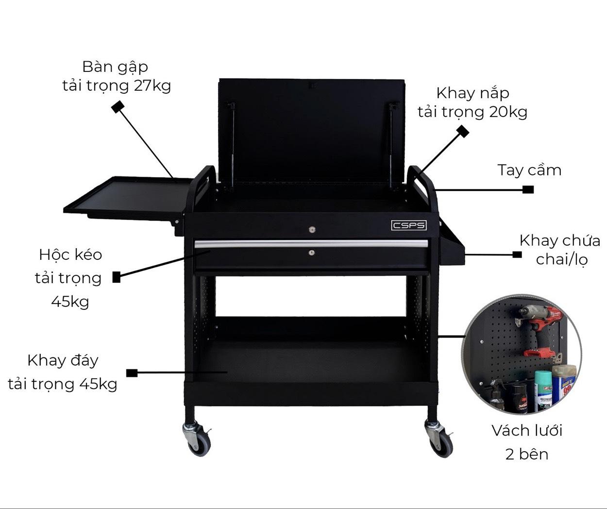 Tủ dụng cụ CSPS 7 ngăn kéo, mặt ván gỗ và vách lưới chất lượng cao. THÔNG SỐ KỸ THUẬT 1 THÔNG SỐ CHUNG Kích thước sản phẩm: 76.4 cm Ngang x 46.2cm Sâu x