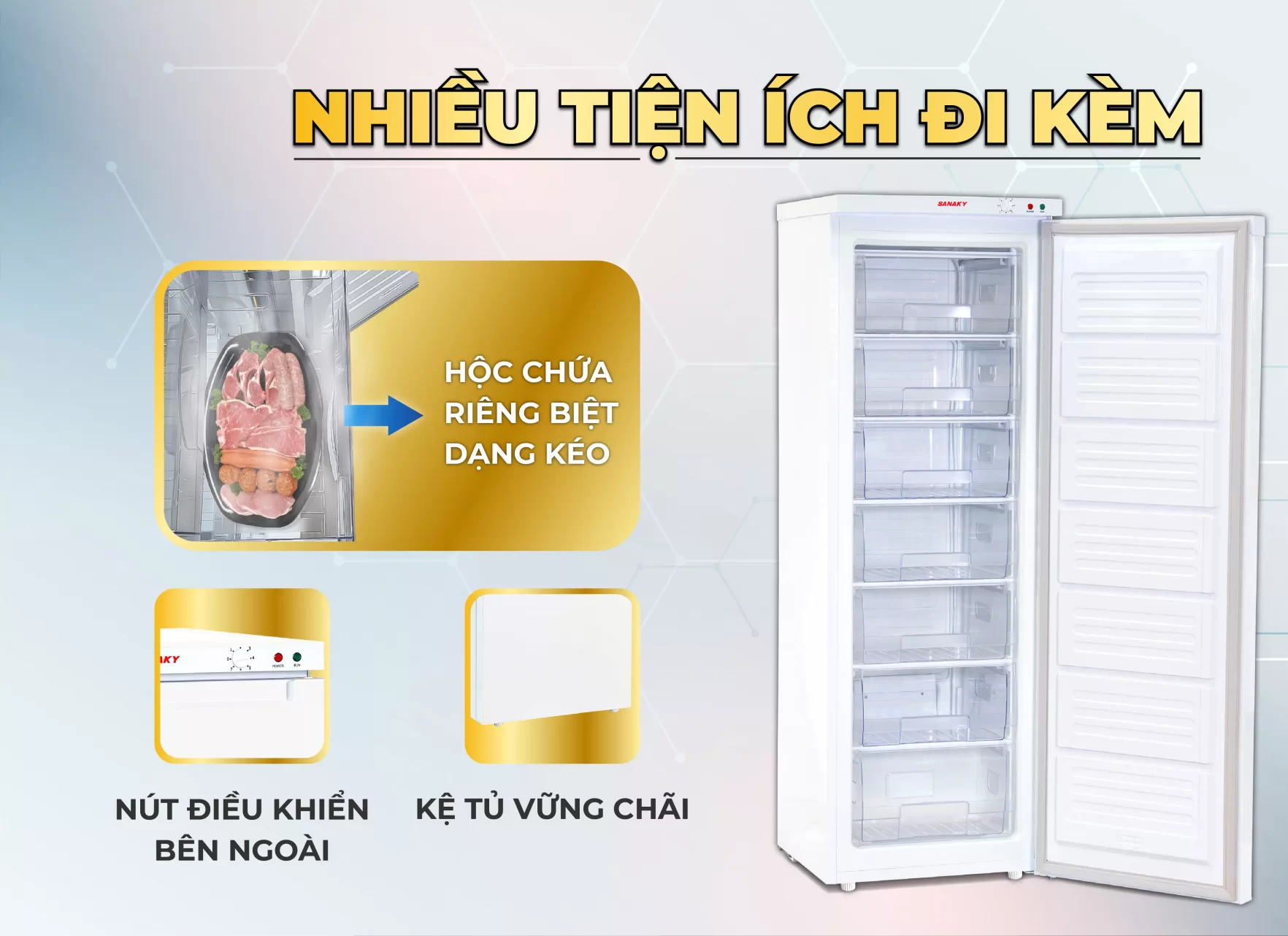 NHIỀU TIỆN ÍCH ĐI KÈM Tủ đông thiết kế với 7 hộc chứa dễ dàng cho việc vệ sinh và sắp xếp thực phẩm, dễ sử dụng, hạn chế thoát nhiệt, tiết kiệm điện năng. Đặc biệt hơn, với sản phẩm tủ đông này, các hộc chứa được thiết kế theo dạng ngăn kéo, rất tiện lợi với việc cất giữ thực phẩm.