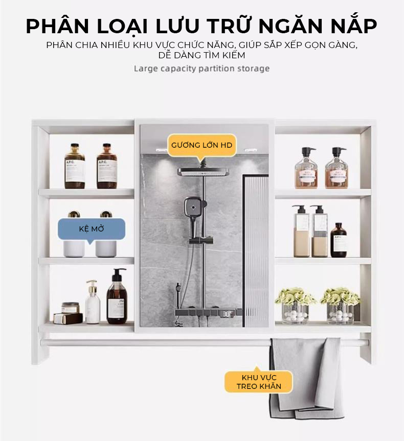 Công năng: tủ đựng đồ dùng, hoá mỹ phẩm,...trong nhà tắm, phòng ngủ....kèm gương soi tiện lợi, tiết kiệm diện tích