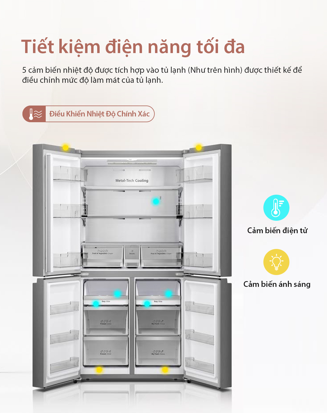 - Tấm Giữ Nhiệt Kim Loại Metal Cooling: Thành sau của ngăn mát được làm bằng thép không gỉ, đảm bảo khí lạnh được phân bố đều từ trong ra ngoài. Sự kết hợp của các công nghệ tiên tiến này đảm bảo nhiệt độ và độ ẩm lý tưởng mọi lúc.