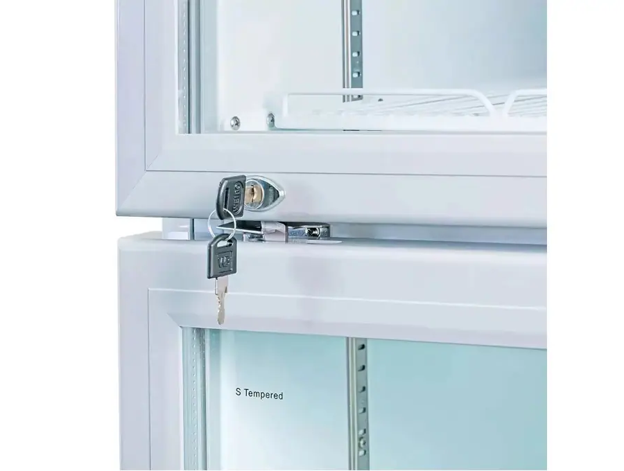 HỆ THỐNG SƯỞI KÍNH BẰNG HƠI NÓNG TỪ COMPRESSOR Giúp mặt kính luôn sáng rõ TỦ MÁT CÓ KHÓA Sử dụng khóa an toàn NGĂN, KỆ CHẮC CHẮN