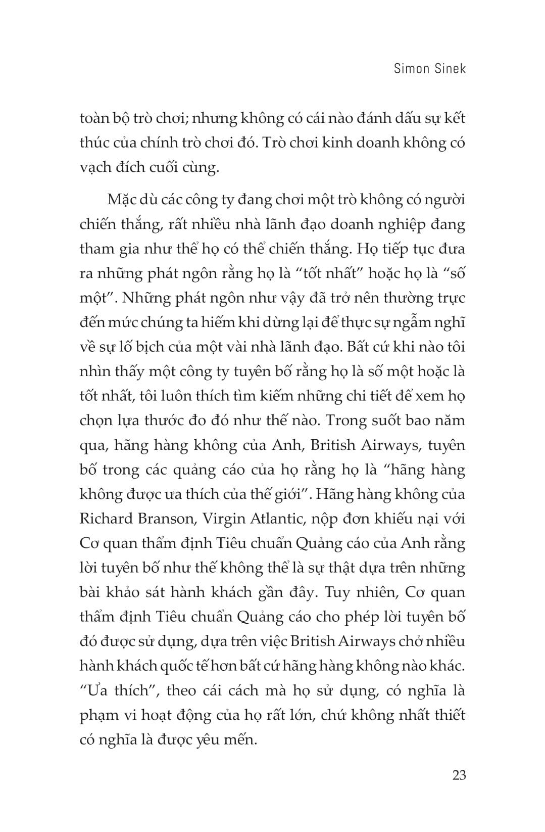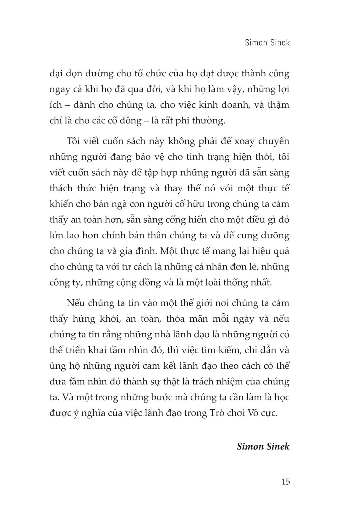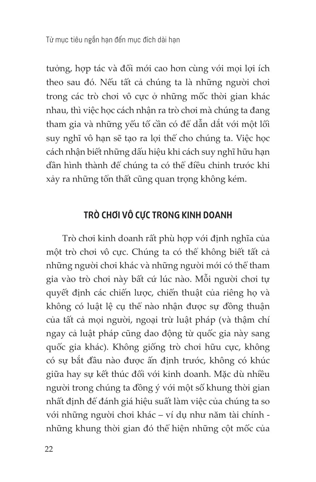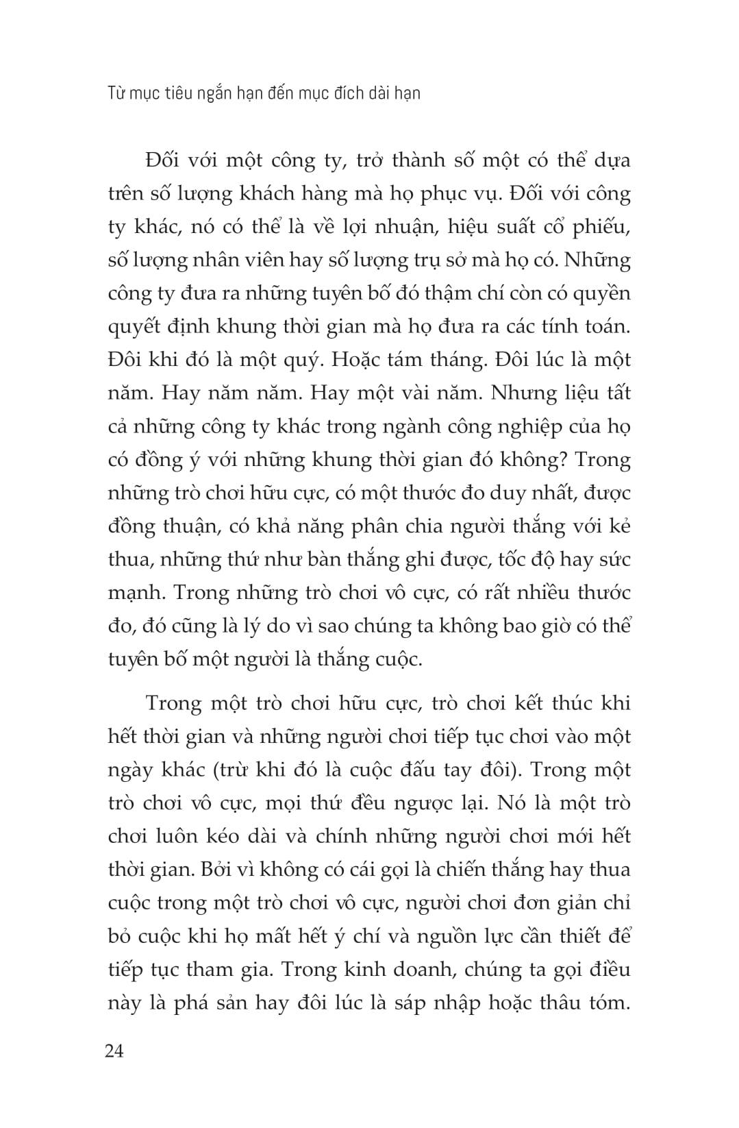 Từ Mục Tiêu Ngắn Hạn Đến Mục Đích Dài Hạn Trong bối cảnh kinh doanh hiện đại, doanh nghiệp đang phải đối mặt với những thách thức chưa từng có, buộc họ phải thay đổi tư duy cạnh tranh để thích ứng và tăng trưởng. Kinh doanh không phải là cuộc đua sẽ kết thúc khi có người về đích, cũng không phải là trò chơi sẽ đi đến hồi kết nếu có người chiến thắng. Những mục tiêu ngắn hạn về doanh số bán hàng hay tăng trưởng lợi nhuận không định nghĩa và đảm bảo vị thế bền vững của một doanh nghiệp. Mục đích không phải là chiến thắng ở mọi mặt trận mà là làm chủ và giữ vững cuộc chơi theo quy tắc ta đặt ra. Đối với một công ty, vị thế dẫn đầu có thể dựa trên số lượng khách hàng mà họ phục vụ. Đối với một công ty khác, đó là có thể quy mô doanh thu, giá cổ phiếu, số lượng nhân viên, số lượng chi nhánh hay văn phòng đang hoạt động trên khắp thế giới. Các công ty cũng là người quyết định khung thời gian họ thực hiện tính toán sổ sách. Đó có thể một quý. Hay 8 tháng. Đôi khi là một năm. Hay năm năm. Hay 12 năm. Thế nhưng, có phải tất cả mọi người trong ngành đều tuân thủ những khung thời gian này. Trong cuộc chơi kinh doanh vô cực, không có một khung tiêu chuẩn duy nhất tách biệt người chiến thắng với kẻ thua cuộc, những thứ như mục tiêu đạt được, tốc độ hay sức mạnh không quyết định tất cả. Trong bối cảnh hiện tại, có nhiều vô số biến số, yếu tố ngăn cản để bạn không bao giờ chiến thắng. Cạnh tranh không bao giờ dừng lại trong kinh doanh. Đối thủ tham gia thị trường rồi biến mất khỏi cuộc chơi khi họ cạn kiệt nguồn lực và ý chí. Và sự “thất bại” này chúng ta gọi đó là phá sản, đôi khi là bị thâu tóm hoặc mua lại. Vậy nên, thay vì bận tâm ai chiến thắng hay ai là người tốt nhất, hãy nghĩ cách làm thế nào để phát triển và củng cố tổ chức với sức mạnh và tiềm lực đủ lớn cho sự tăng trưởng bền vững. Và tư duy vô hạn này cũng giúp công ty phát triển mạnh mẽ hơn trong ngắn hạn. Những lãnh đạo có tư duy vô hạn tin rằng việc không thể linh hoạt sẽ giới hạn đáng kể khả năng phát triển mục đích của doanh nghiệp và tiếp tục con đường đó sẽ dẫn đến sự sụp đổ tất yếu. Đã đến lúc lãnh đạo doanh nghiệp phải thay đổi nền tảng và trọng tâm chiến lược. Cuốn sách “Từ mục tiêu ngắn hạn đến mục đích dài hạn” sẽ hướng dẫn bạn cách đúng đắn để chơi trò chơi kinh doanh vô cực này. Qua đó tác giả Simon Sinek đã đưa ra một chiến lược để dẫn đầu với tư duy vô hạn. Những nhà lãnh đạo với lối suy nghĩ vô hạn, sẵn sàng thách thức hiện trạng và thay thế nó với một thực tế mới sẽ có khả năng khiến cho bản ngã con người cố hữu của tất cả chúng ta cảm thấy an toàn hơn, sẵn sàng cống hiến cho một điều gì đó lớn lao hơn chính bản thân và cung dưỡng cho chúng ta cũng như gia đình, để từ đó xây dựng các tổ chức mạnh mẽ hơn và sáng tạo hơn trên toàn thế giới.