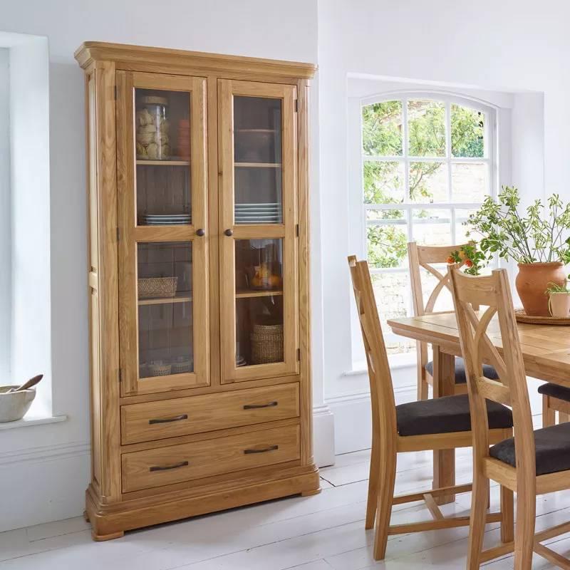Tủ trưng bày 2 cánh kính Canterbury được làm từ gỗ sồi trắng Mỹ nhập khẩu, mang vẻ ngoài tuyệt đẹp, rất phù hợp cho không gian phòng khách của gia đình. Toàn bộ bề mặt tủ được sơn PU cao cấp giúp bảo vệ lớp gỗ bên trong và vẻ đẹp tự nhiên của các vân gỗ. Thiết kế ngăn tủ kính chắc chắn, với các mặt kệ vững chãi, chịu được trọng lượng lớn, giúp trưng bày các đồ dùng trong nhà thêm phần sang trọng. Hai ngăn kéo rộng rãi, được làm thủ công kết cấu ghép mộng cực kì chính xác, đáp ứng lượng lưu trữ tuyệt vời. Sản phẩm mang đặc trưng của bộ sưu tập Canterbury truyền thống, với những chi tiết cắt góc cạnh bo tròn mềm mại, cạnh nóc và chân loe tinh tế. Mặt ngăn kéo giật cấp cổ điển, kết hợp tay cầm kim loại tối màu tạo nên một tổng thể thanh lịch và hiện đại.