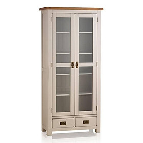 Tủ trưng bày 2 cánh kính Kemble được làm từ gỗ sồi trắng Mỹ chắc chắn, sơn màu trắng xám nhẹ nhàng, tươi sáng phù hợp với rất nhiều không gian nội thất khác nhau như phòng khách, phòng làm việc, thậm chí phòng bếp. Thiết kế với năm ngăn kệ đằng sau cánh cửa kính với khả năng chịu lực cực tốt, là nơi trưng bày các đồ dùng cần thiết như ly, tách, các vật dụng sưu tầm bạn yêu thích mà không sợ mặt kệ bị cong hay nứt gãy. Hai ngăn kéo được làm thủ công, kết cấu ghép mộng chắc chắn, hỗ trợ cất giữ những vật dụng khác tạo sự ngăn nắp và gọn gàng. Thiết kế đặc trưng bởi các chi tiết vát cạnh tinh tế, tay cầm cổ điển mang lại sự hài hòa và sang trọng đặc trưng của bộ sưu tập Kemble vốn có.