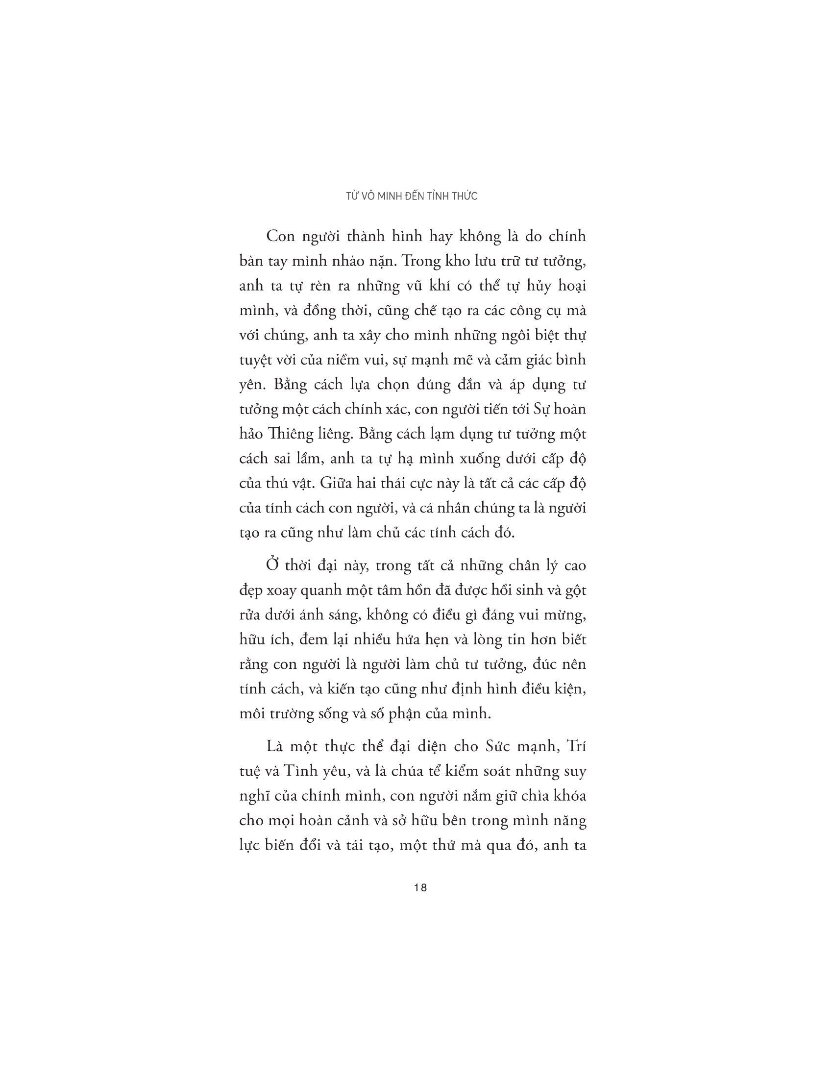 Từ Vô Minh Đến Tỉnh Thức “Mỗi hạt giống suy nghĩ được gieo vào tâm trí và bén rễ ở đó sẽ tự sinh trưởng và nở hoa thành hành động, rồi tạo nên những cơ hội và hoàn cảnh cụ thể. Ý nghĩ tốt lành đậu quả ngọt thơm, ý nghĩa xấu xa đậu quả mục rỗng”. As a man thinketh – Từ vô minh đến tỉnh thức là tuyển tập những tác phẩm nổi tiếng nhất của triết gia thiên tài người Anh – James Allen. Cuốn sách này là những dòng suy ngẫm của tác giả về bản chất con người, với tư cách là một cá thể độc lập cũng như một thành viên của xã hội. Thế giới bên ngoài, rực rỡ, đẹp đẽ hay tăm tối xấu xa, hoàn toàn phụ thuộc vào cách ta nuôi dưỡng thế giới nội tâm của m.ình. Trong hành trình vun xới cho khu vườn tâm trí ấy, liệu ta có biếng lười mà thả m.ình theo những cám dỗ ngọt ngào hiểm ác, hay sẽ can đảm lựa chọn một con đường dẫu gian lao nhưng lương thiện, trong sáng và được ban phước lành? Về tác giả: James Allen (1864 – 1912) là một người bí ẩn trong giới sách vở, nhưng những bài viết đầy cảm hứng của ông đã tác động đến hàng triệu người. Những chiêm nghiệm sâu sắc của ông về nội tâm con người - cụ thể là cách con người suy nghĩ, cảm nhận và tu dưỡng đạo đức - vẫn còn nguyên giá trị và thường xuyên được trích dẫn lại, ngay cả khi những cuốn sách ông viết đã được xuất bản cách đây hơn một trăm năm, trong những năm đầu tiên của thế kỷ 20. James Allen hướng tới sống một cuộc đời lý tưởng theo miêu tả của tiểu thuyết gia vĩ đại người Nga Lev Tolstoy, một cuộc sống tự nguyện nghèo khó, đề cao lao động chân tay và gìn giữ kỷ luật một cách khổ hạnh. Giống như Tolstoy, Allen tìm cách cải thiện bản thân m.ình, biết hạnh phúc và trở thành một con người toàn diện về đạo đức. Những tác phẩm của Allen một mặt thể hiện ảnh hưởng của chủ nghĩa Tin lành tự do và mặt khác thể hiện tư tưởng Phật giáo. Allen tập trung vào sức mạnh của mỗi cá nhân trong việc hình thành tính cách và tạo ra hạnh phúc cho chính m.ình. Ông nói, tư duy và tính cách là một, và vì tính cách chỉ có thể tự bộc lộ thông qua môi trường và hoàn cảnh, nên các điều kiện bên ngoài của cuộc sống một người sẽ luôn liên quan một cách hài hòa với nội tâm của họ. Những lời khen tặng “Đến ngày hôm nay, tác phẩm của James Allen về sức mạnh của tâm trí vẫn giá trị như khi nó được viết ra một thế kỷ trước.” “As a Man Thinketh là một cuốn sách cách mạng giúp mang tới nhận thức về sức mạnh của tiềm thức, thành tựu và những suy nghĩ tích cực” “As a Man Thinketh là một cuốn sách ngắn nhưng có khả năng và sẽ thay đổi cuộc đời bạn.”