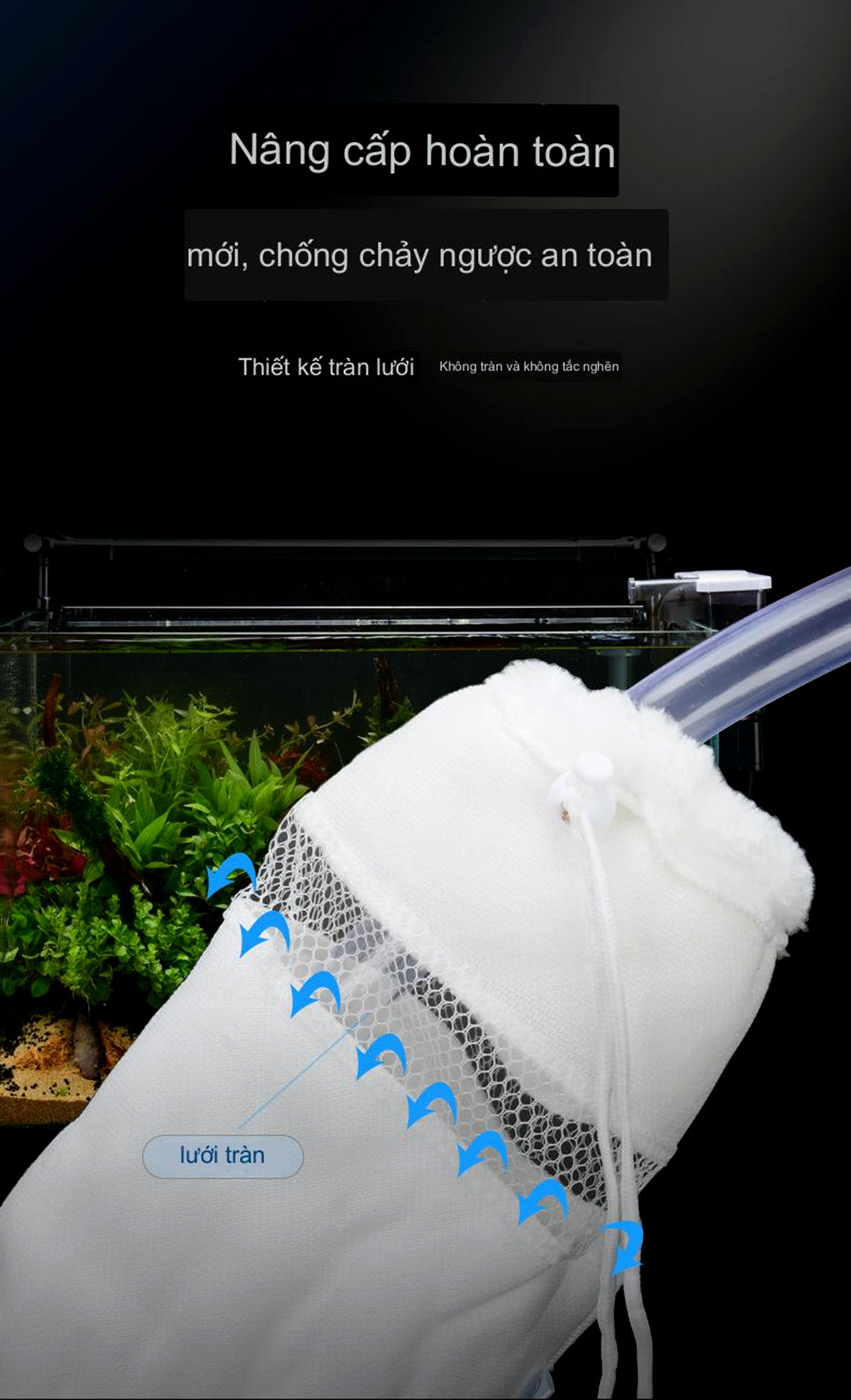 - Túi lọc có quai nhựa dễ dàng thao tác chỉ cần gác túi lọc vào đường ống máy bơm nước vào hộp lọc tràn trên hoặc đường ống hút đáy.