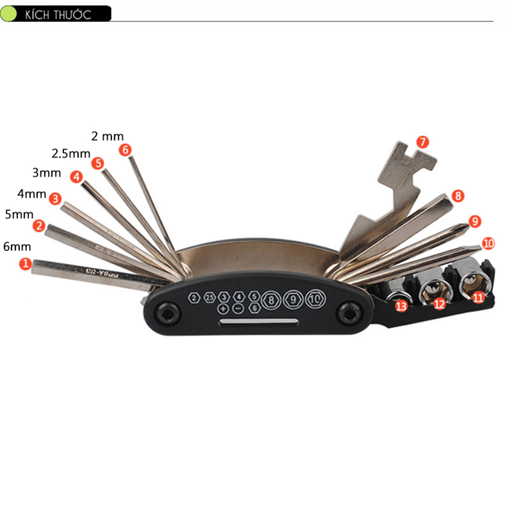 Dụng cụ cân vành, cờ lê tăng và rút nan hoa chất liệu: thép carbon cao mạ trắng Trên cờ lê có đánh số các đầu cờ lê to nhỏ khác nhau tương ứng với