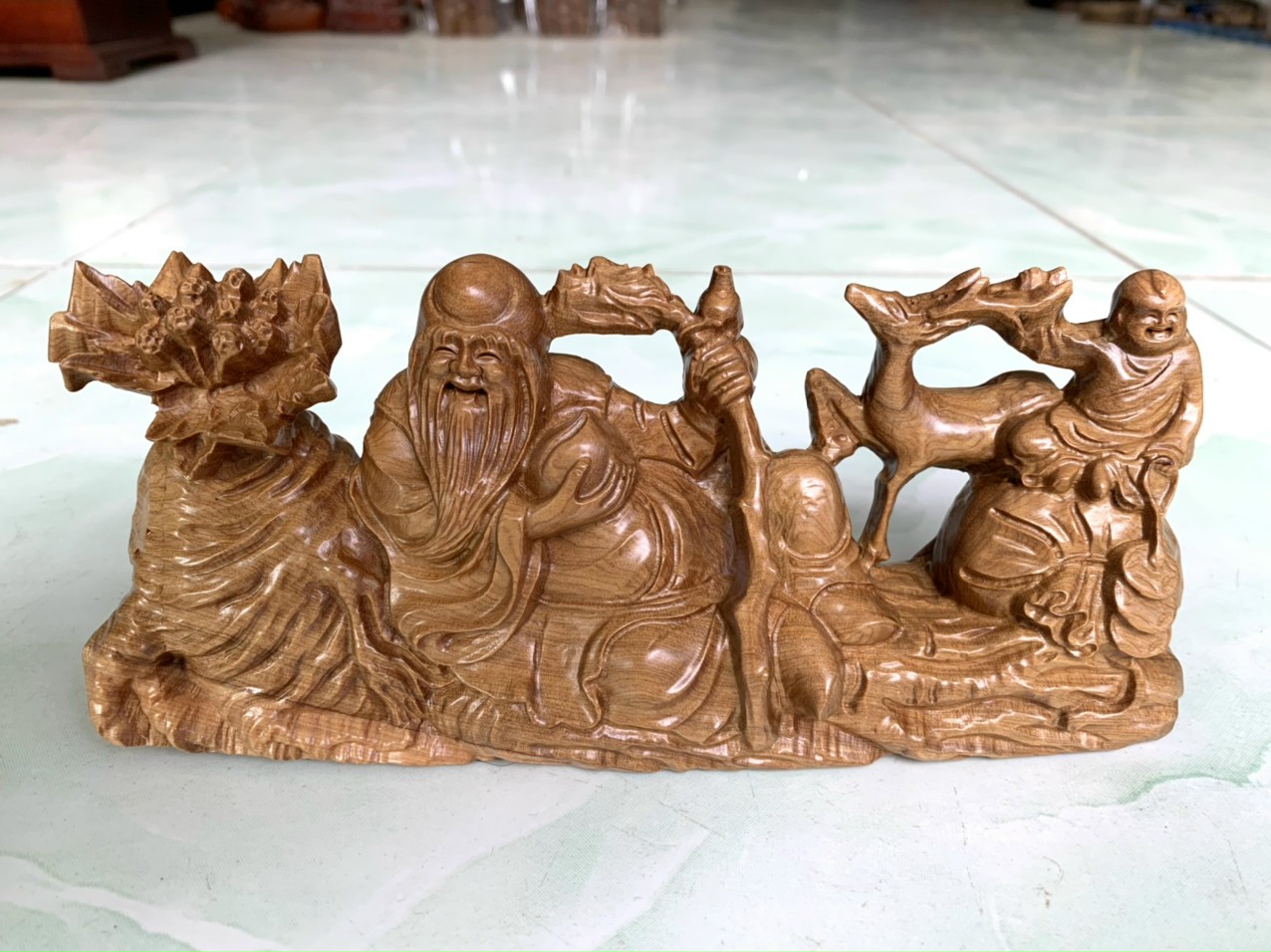 ✨Tượng Cụ thọ hươu củ sâm bằng gỗ bách xanh thơm nức kt 20×9×5cm