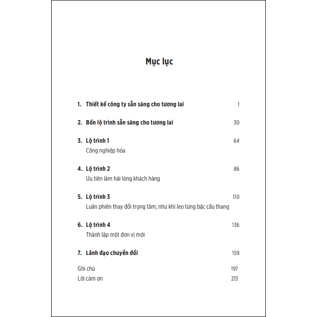 Mỗi công ty đi theo từng lộ trình khác nhau hoặc áp dụng đa lộ trình đều có những khó khăn và cơ hội riêng, và thông qua những nghiên cứu tình huống chi tiết này, bạn có thể chọn được lộ trình phù hợp nhất cho doanh nghiệp của mình. Phần cuối cuốn sách tiếp tục thảo luận các giá trị mà công ty cần nắm bắt trong quá trình chuyển đổi và vai trò của ban lãnh đạo trong quá trình này, kèm theo các bài tập đánh giá.