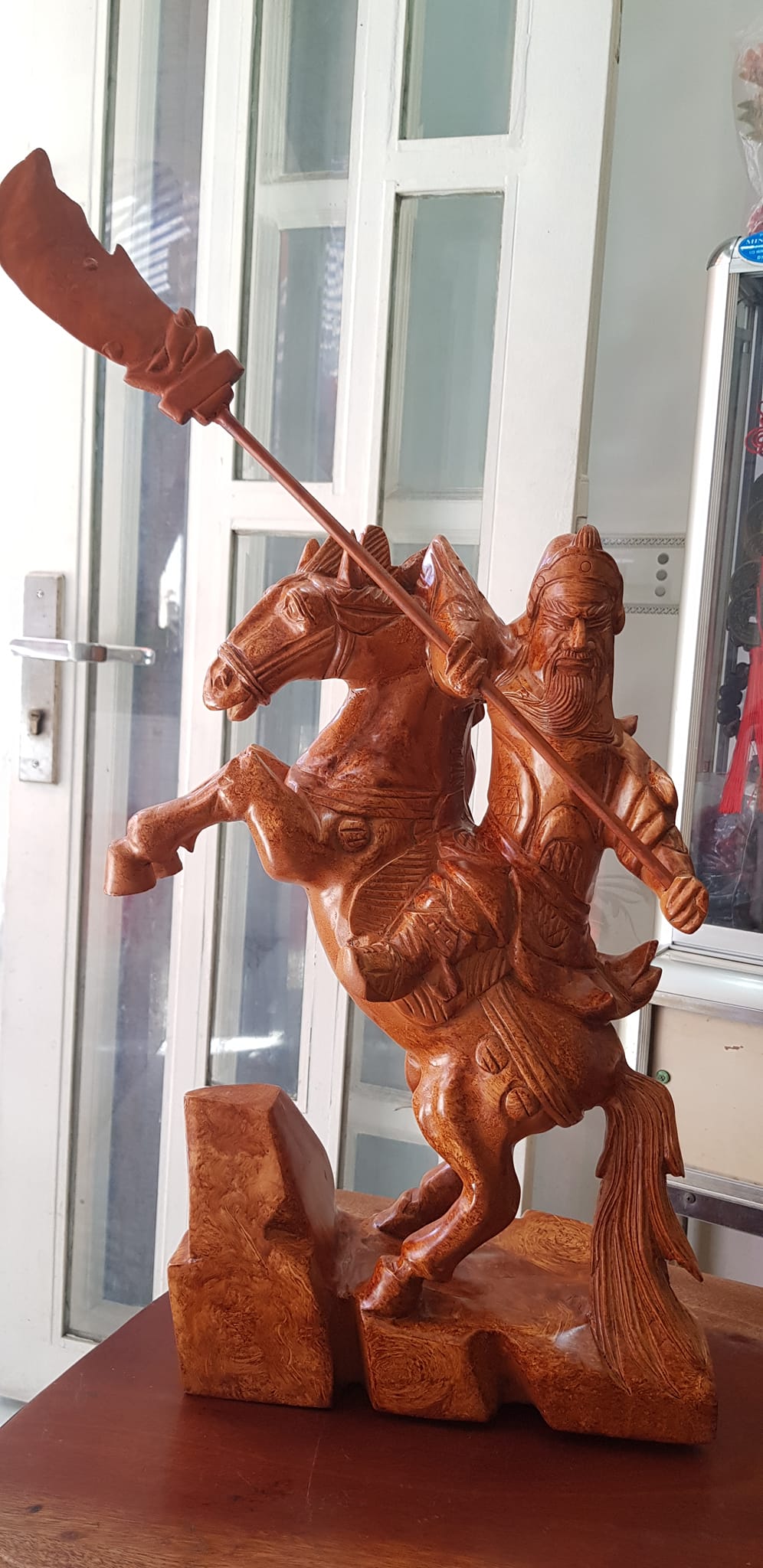 Tượng Quan Công cưỡi ngựa gỗ nu gõ hay gỗ gõ vẽ nu cao 50cm ( tính đao 70cm ) x Ngang 40cm x Sâu 15cm Biểu tượng sức mạnh sự dũng mãnh kiên cường