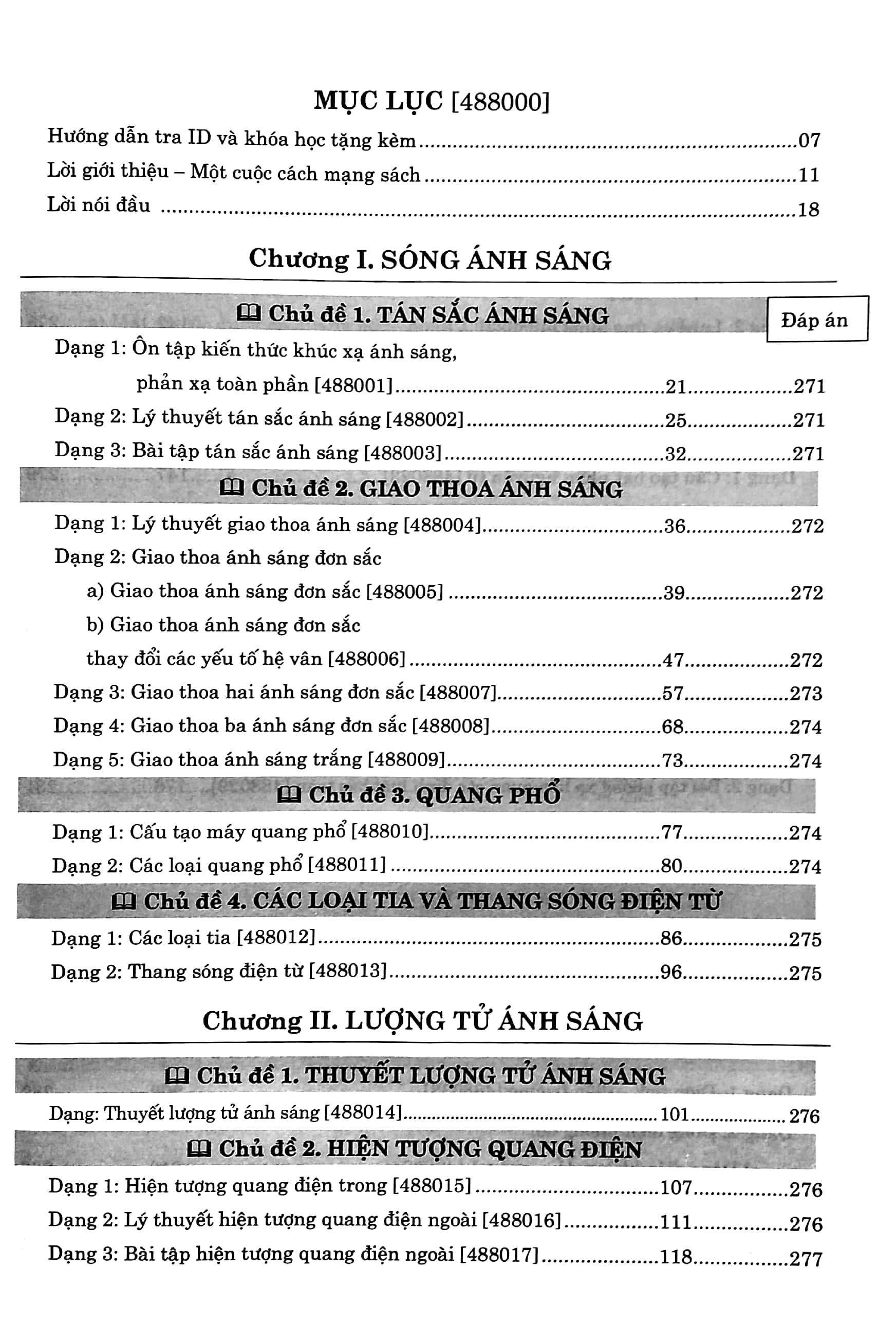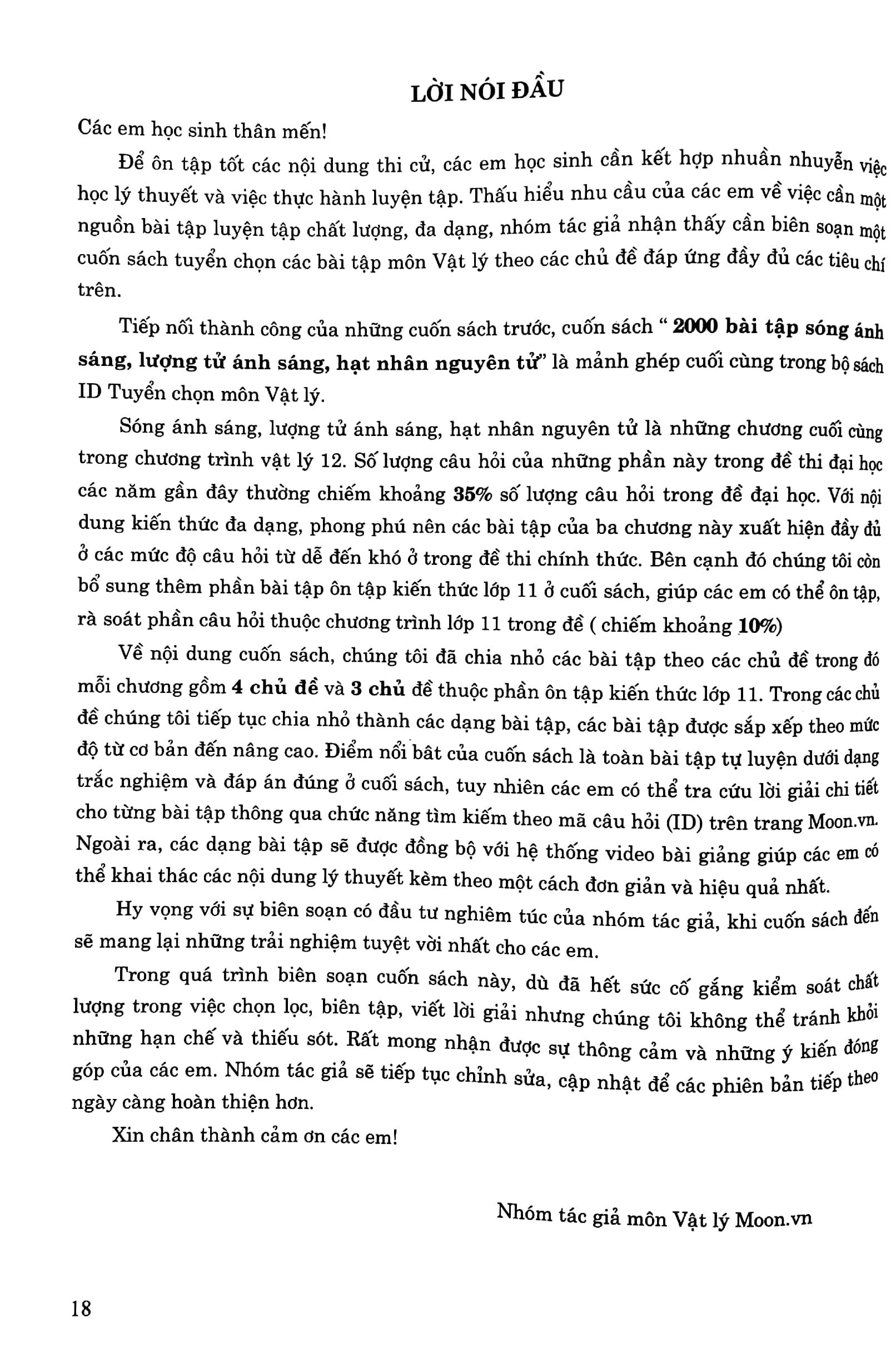 Sóng ánh sáng, lượng tử ánh sáng, hạt nhân nguyên tử là những chương cuối cùng trong chương trình vật lý 12. Số lượng câu hỏi của những phần này trong đề thi đại học các năm gần đây thường chiếm khoảng 35% số lượng câu hỏi trong đề đại học. Với nội dung kiến thức đa dạng, phong phú nên các bài tập của ba chương này xuất hiện đầy đủ ở các mức độ câu hỏi từ dễ đến khó ở trong đề thi chính thức. Bên cạnh đó chúng tôi còn bổ sung thêm phần bài tập ôn tập kiến thức lớp 11 ở cuối sách, giúp các em có thể ôn tập, rà soát phần câu hỏi thuộc chương trình lớp 11 trong đề (chiếm khoảng 10%).