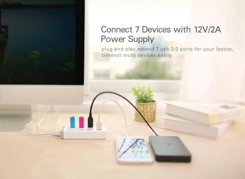 1.Input: 1x USB-C Female (data transfer only) 2.Output: 7x USB3.0 Female 3.Total Output: 5V/3.4A Max 4.Power Supply: DC 5.5mm, 12V/2A 5.USB3.0 5Gbps 6.Compliance with BC 1.2 fast charging protocol (only available for USB3.0 ports from