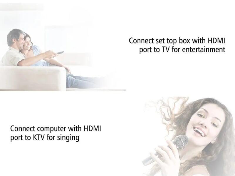 - Bộ chia HDMI Switch Vention 1 ra 2 cho phép chia một tín hiệu ra hai cổng HDMI, hỗ trợ đệm và khuếch đại tín hiệu đầu ra cho hình ảnh và âm thanh