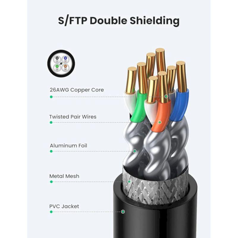 Cáp mở rộng Ethernet UGREEN Cat 8 được thiết kế với 4 cặp xoắn lá được bảo vệ và một lớp bảo vệ lưới kim loại bên trong (S / FTP). Thiết kế này có thể giảm đáng kể nhiễu và xuyên âm từ các cặp liền kề và các loại cáp khác, giúp tốc độ mạng nhanh hơn và ổn định hơn.