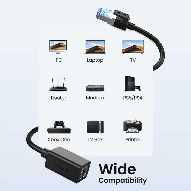 Cáp nối dài mạng LAN CAT 8 dài 2m Ugreen 50200 có thể tương thích hoàn hảo với máy tính, máy tính xách tay, modem, bộ định tuyến, PS5, PS4, PS3, X-Box 360, X-Box One, thiết bị chuyển mạch mạng, ADSL, bộ điều hợp mạng, trung tâm và các mạng khác thiết bị có đầu nối RJ45. Nó cũng có thể hoàn toàn tương thích ngược với Cat7, Cat6e, Cat6, Cat5e, Cat5.