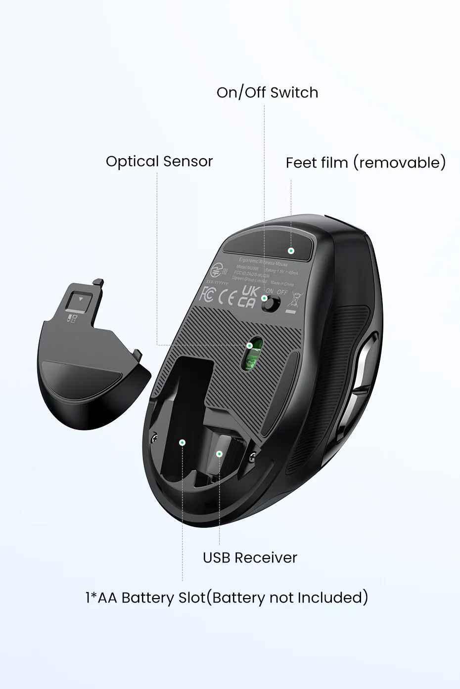 1. Brand: UGreen 2. Product name: Wireless mouse 3. Model: MU105 4. Color : Celadon Green 5. Connection method: 2.4G wireless (USB receiver) 6. Working distance: 10 meters 7. Sensitivity: 800/1200/1600/2400 (four gears) 8. Return