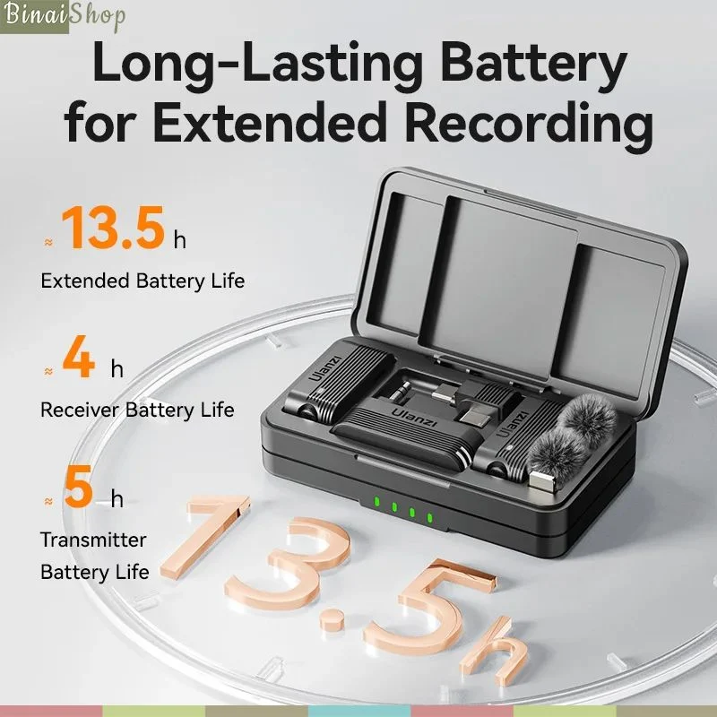 - Transmitter: 3.7V/70mAh/0.259Wh -Receiver: 3.7V/70mAh/0.259Wh -Charging Case: 3.7V/800mAh/2.96Wh Transmitter Weight 8.8g/0.02lb Receiver Dimensions 482513mm/1.910.5inch Receiver Weight 9.6g/0.02lb Sampling Rate 32kHz 16bit Battery Life -Transmitter(on a single charge): ≈5h -Receiver(on a single charge): ≈4h -Charging Case: Charging both transmitters simultaneously over twice Frequency Response 20Hz-20kHz Audio Channel Mono Audio Wireless Transmission Distance ≥20m Data Transmission Bluetooth 5.3+EDR Charging Time -Transmitter: ≈1.5h -Receiver: ≈1.5h -Charging Case: ≈1.5h Noise Reduction Support Delay 30ms Signal-to-Noise Ratio ≥58dB Keyword:Ulanzi A100, A100, micro ulanzi, micro thu âm, micro cài áo không dây, micro không dây phát trực tiếp, micro không dây cho máy ảnh, micro cho điện thoại.