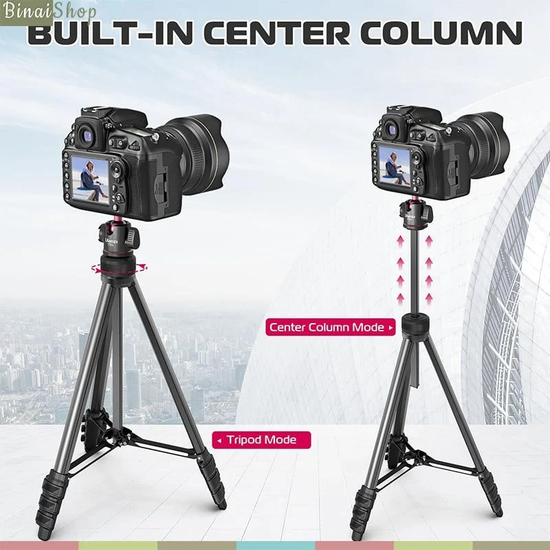 - Chiều cao có thể điều chỉnh với chân 4 đoạn và một cột trung tâm, cố định 3 chân chắc chắn bằng khóa đòn bẩy. Chiều cao mở rộng tối đa là 1380 mm.