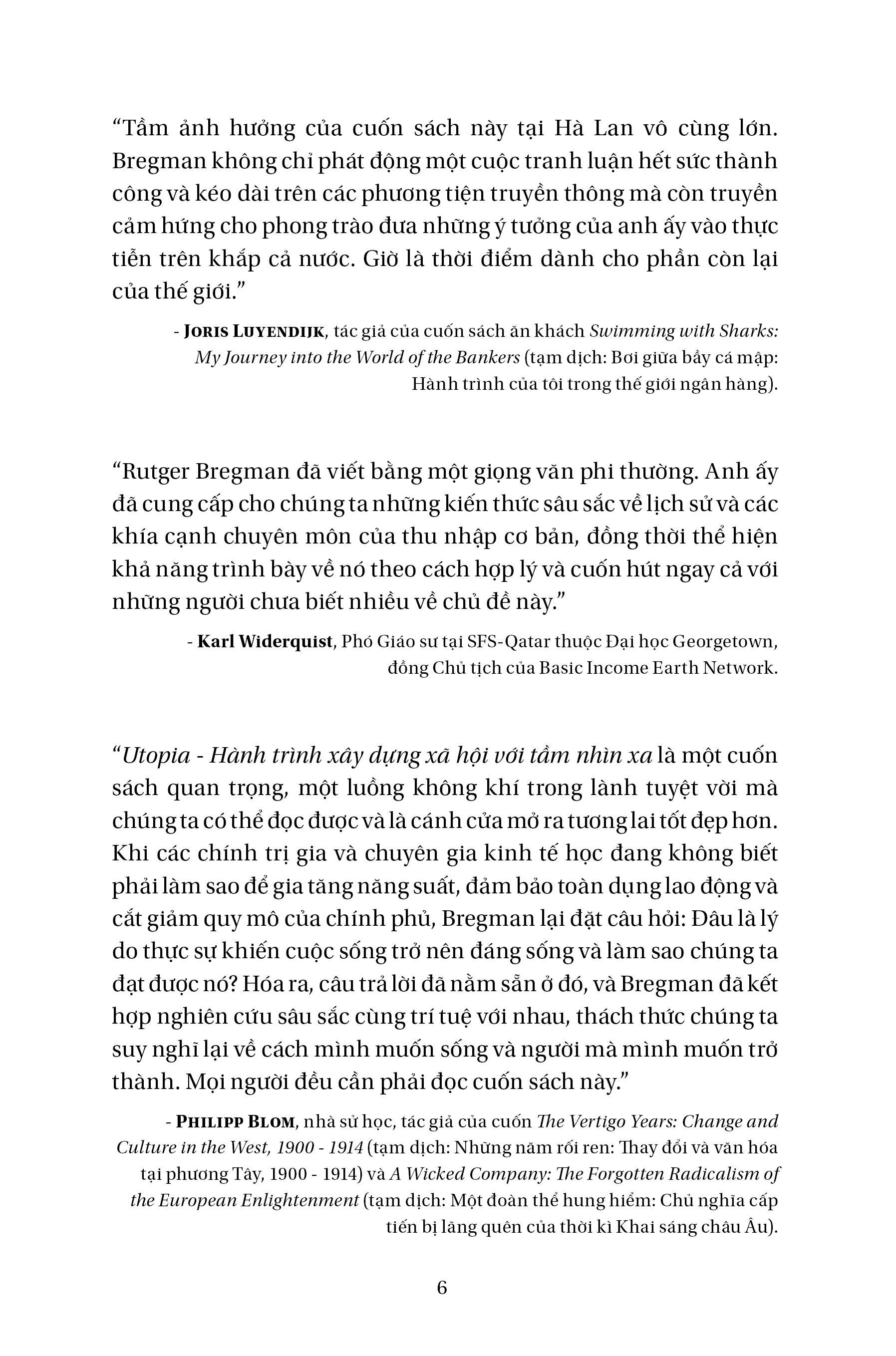 Utopia – Hành trình xây dựng xã hội với tầm nhìn xa là tác phẩm tràn đầy nhiệt huyết của một nhà sử học tài hoa, là ngôn ngữ đầy lương tri trong xã hội còn nhiều bất cập. Với phong cách viết sống động, linh hoạt, với các luận chứng, luận cứ xác đáng, đầy sức thuyết phục và với tư tưởng sắc bén, nhanh nhạy, Rutger Bregman đã tiến hành quan sát và phân tích những vấn đề trọng đại về sự phát triển của xã hội cũng như tương lai của nhân loại một cách hết sức mộc mạc mà thực tế. Cuốn sách nhận được đánh giá cao từ giới học thuật, giới trí thức, cũng như giới xuất bản – truyền thông. Đồng thời cuốn sách còn nhận được sự khẳng định và những lời giới thiệu rất nhiệt tình đến từ các học giả, tác giả đi trước. Điều này không hề khó hiểu bởi Rutger Bregman đã viết sách với quan điểm mới mẻ, lập trường sắc bén, văn phong độc đáo, cùng với đó còn bao hàm tinh thần chủ nghĩa lí tưởng và thái độ của chủ nghĩa hiện thực phê phán.