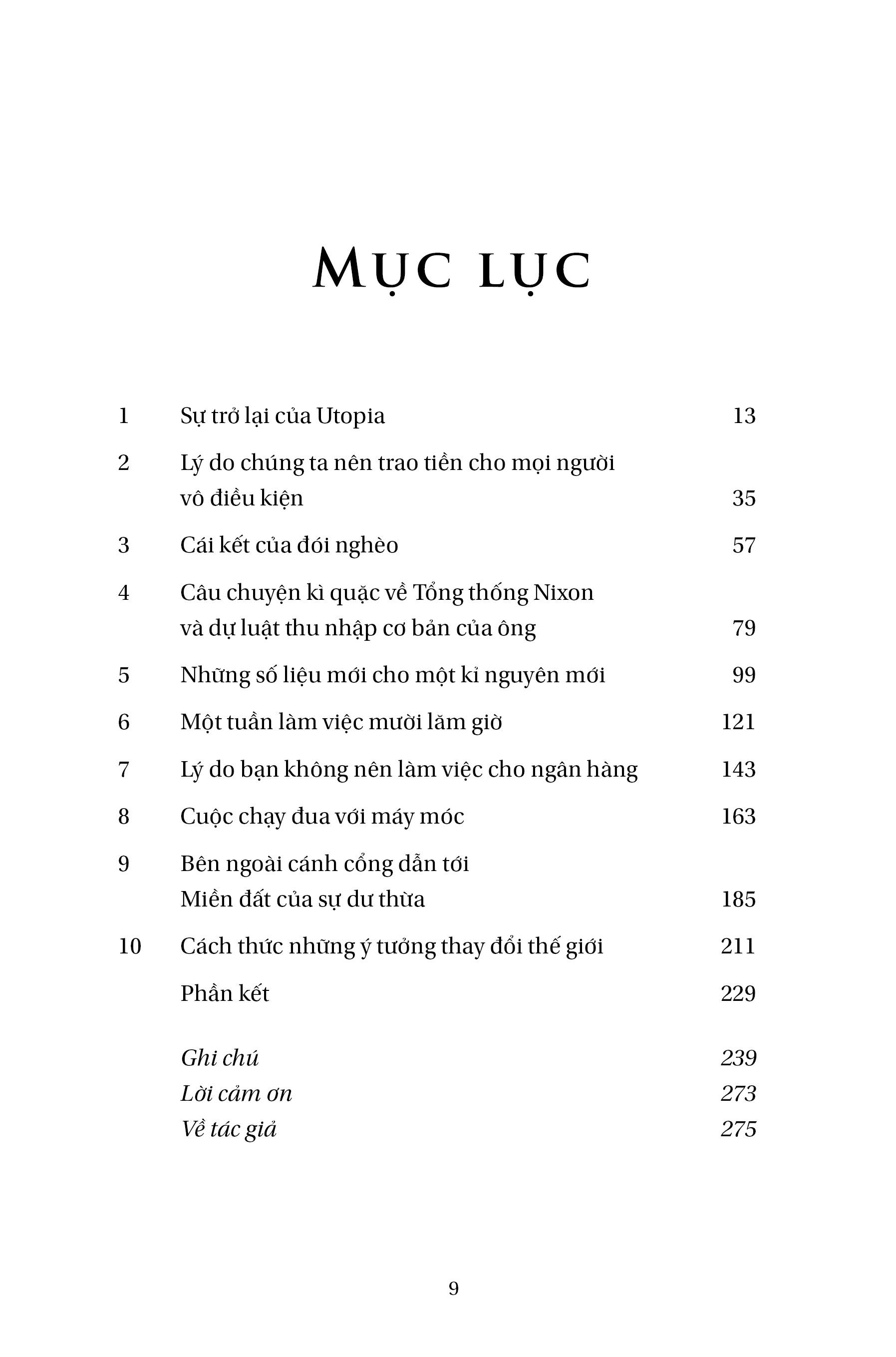 Trong cuốn sách này, Rutger Bregman đã phân tích, lí giải hàm ý của Utopia, thuật lại quá trình nảy sinh ra tư tưởng Utopia trong lịch sử và cả ý nghĩa tích cực cũng như tính tất yếu của xã hội. Nghèo đói, bất công, những điều này đều khơi dậy khao khát của con người đối với “Miền đất của sự dư thừa” (The Land of Plenty), đồng thời nỗ lực hết mình để đạt được điều đó. Trong thực tiễn chính trị xã hội hiện đại cũng tồn tại một vài trải nghiệm mang màu sắc Utopia, ví như “Dự luật thu nhập cơ bản” của cựu tổng thống Mỹ Richard Nixon. Quan niệm dẫn dắt hành động, và nếu chúng ta kiên trì thực hiện hành động trong thời gian dài thì nó sẽ trở thành hiện thực. Đây cũng chính là ý nghĩa của Utopia.