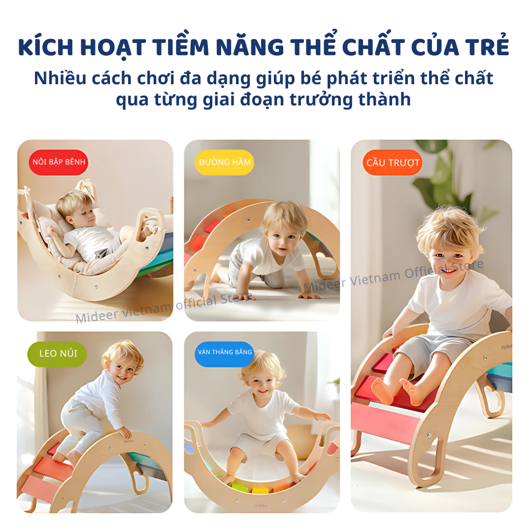 Mua tại TiktokCHÀO MỪNG BẠN ĐẾN VỚI MIDEER VIETNAM HÀNG SẴN SHIP HỎA TỐC, BẢO HÀNH CHÍNH HÃNG ————————————— Ván thăng bằng montessori bập bênh vận động cho bé Mideer Rainbow Wooden Climber Ván thăng bằng montessori bập bênh vận động cho bé Mideer là vòm leo đa năng trong nhà, kết hợp thiết kế nhỏ gọn, khả năng chịu lực cao, và chất liệu thân thiện với môi trường. Sản phẩm mang đến trải nghiệm tập luyện hiệu quả và an toàn cho trẻ. 8 Lý do Ba Mẹ Nên Chọn Ván thăng bằng montessori bập bênh vận động cho bé Mideer Rainbow Wooden Climber