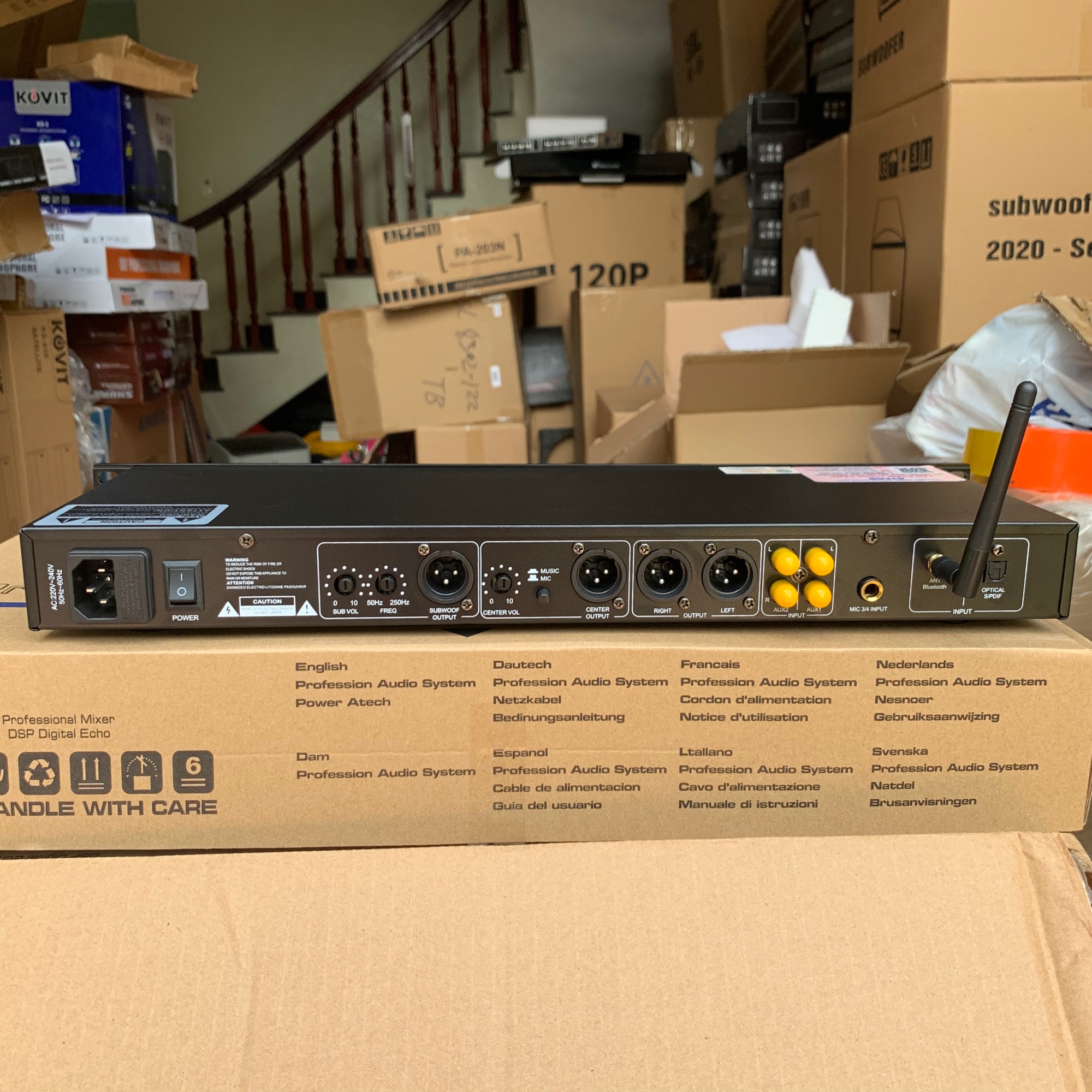 Main đẩy liền Vang JA S6-500 - Hàng Chính Hãng  MAIN LIỀN VANG S6 - 500 là dòng thiết bị âm thanh thông minh cho dàn combo Karaoke của bạn. Sản phẩm được tích hợp tính năng củaMAIN CÔNG SUẤT và VANG CƠ, là sự kết hợp giữa tính năng công suất với mạch chỉnh âm hiện đại của vang số cho ra âm thanh đầu ra hay và cực kỳ chất lượng. Với sự tiện ích 2 IN 1 của MAIN LIỀN VANG S6 - 500, giúp cho người tiêu dùng tiết kiêm được chi phí đầu tư cho bộ dàn Karaoke tại gia cũng như tiết kiệm được diện tích sử dụng.       Mặt trước của main liền vang: + Với thiết kế hình hộp chữ nhật, kích thước nhỏ gọn 530 x 500 x 220 mm (Rộng x Dài x Sâu) nên bạn dễ dàng sử dụng mà không chiếm nhiều diện tích khi tích hợp với Micro và loa,... + Toàn bộ linh kiện của thiết bị đều được bảo bọc bởi vỏ máy làm từ chất liệu hợp kim cao cấp, bề mặt sơn tông màu đen sang trọng, thời thượng nâng cao khả năng chống han gỉ, bảo vệ sản phẩm bền bỉ hơn. + Main có màn hình LCD ở giữa báo chế độ cường độ âm thanh với các nút vặn volume tắt mở nhạc, tắt mở mic, chỉnh lớn nhỏ Echo, phim bấm được thiết kế 2 bên góp phần tăng thêm tính thẩm mỹ của thiết bị. + Có nút bấm nhanh chuyển chế độ USB, Bluetooth cùng với nút INPUT có chức năng chuyển chế độ kết nối đầu vào trên S6 - 500. + Main có 5 ngõ kết nối micro: 3 cổng ở mặt trước, 2 cổng ở mặt sau.     Mặt sau của main liền vang: + Mặt sau của thiết bị là hệ thống các đường kết nối tín hiệu âm thanh vào và ra, các cổng kết nối thông dụng của thiết bị âm thanh và một số thông tin kỹ thuật cơ bản khác.   Bên cạnh đó, mặt sau của main còn có quạt tản nhiệt, giúp cho main không bị quá nóng khi hoạt động với cường độ cao. MAIN LIỀN VANG S6 - 500 được tích hợp bởi chip xử lý âm thanh, sau khi âm thanh được main liền vang S6 - 500 xử lý và khuếch đại ra lo chuyên nghiệp với bản nhạc đầy đủ âm sắc, hạn chế tối đa tạp âm, méo hay vỡ tiếng, chống hú rít. Với thiết kế 2 kênh riêng biệt, với mức công suất 500W/ 8Ω và 600W/ 4Ω cùng với 4 đường ra loa nên tăng khả năng kéo được 2 cặp loa Bass mang đến âm thanh sống động, chân thực. Được hỗ trợ 4 cổng kết nối Bluetooth-USB-Optical-COAXIAL-AUX1/AUX2 nên người dùng dễ dàng kết nối với các thiết bị như smartphone, laptop, tablet, tivi thông minh… mang đến trải nghiệm giải trí không giới hạn cho gia đình. Dễ dàng kết hợp với các dòng thiết bị âm thanh được trang bị hệ thống kết nối thông minh, linh hoạt thuận tiện cho quá trình phối ghép với các thiết bị như loa karaoke, loa sub, micro không dây...đem tới bộ dàn hiện đại và chuyên nghiệp nhất và đáp ứng tối đa nhu cầu karaoke, nghe nhạc tại gia hoặc các không gian mở ngoài trời.