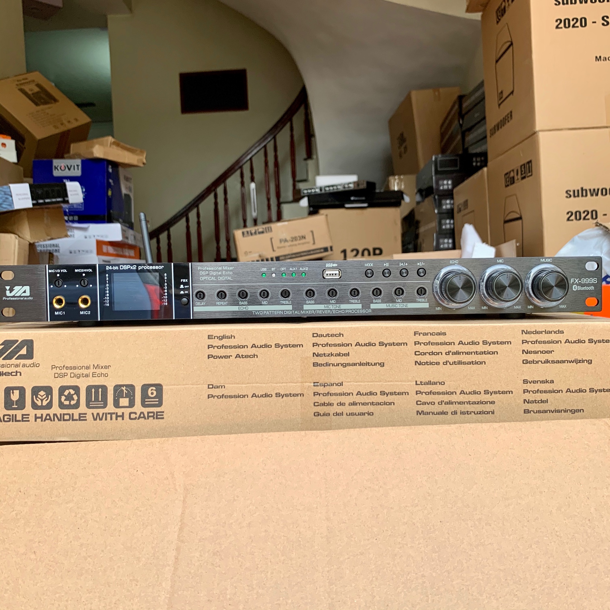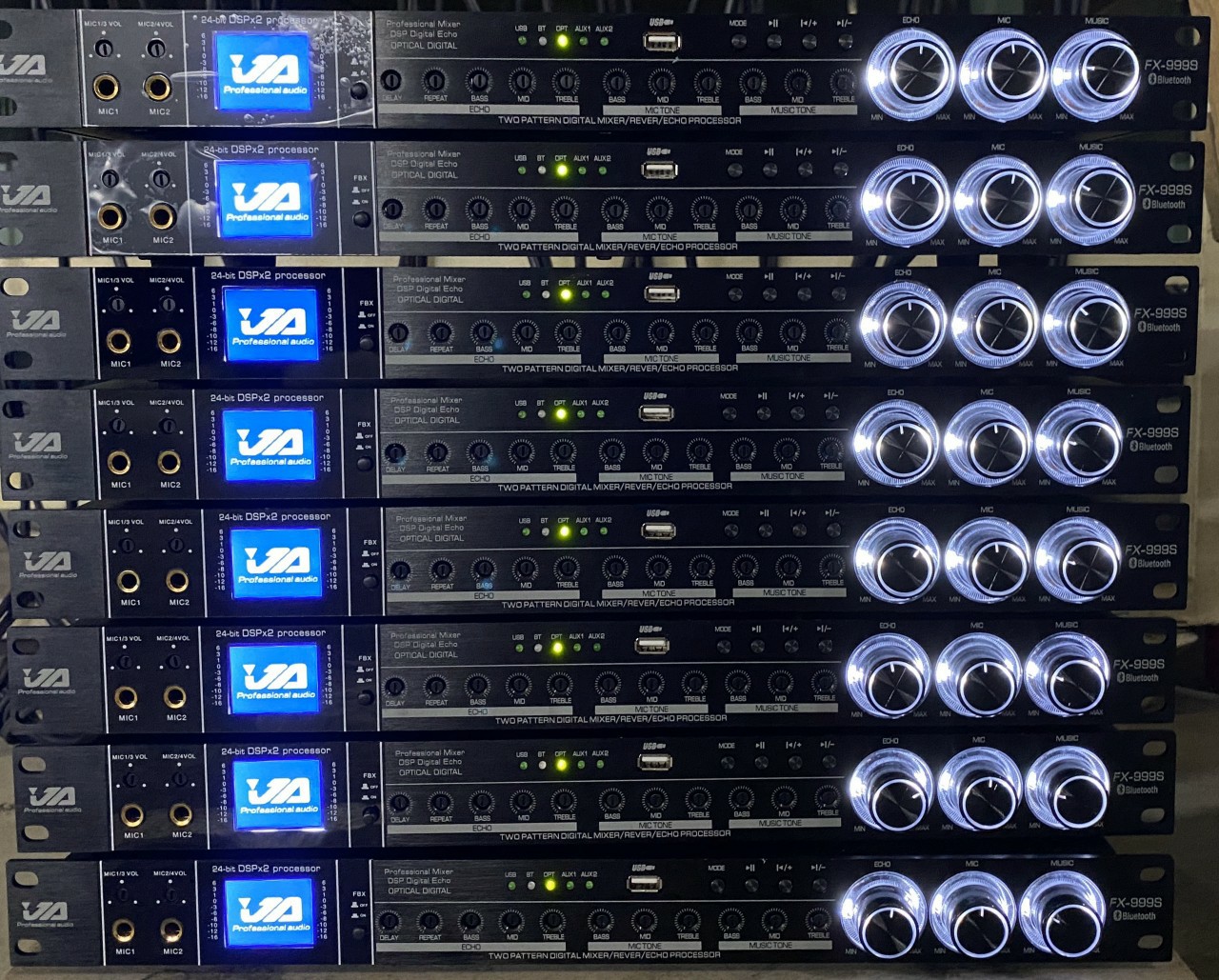 Vang cơ chống hú JA FX-999S • Với thiết kế các cần chỉnh ẩn sâu bên trong hạn chế tối đa tình trạng sai lệnh cần chỉnh vô ý, đảm bảo độ hoàn hảo cho âm thanh giải trí của bạn. • VANG CƠ JA FX-999S Chính Hãng, cung cấp - 3 nhóm Micro với 4 ngõ vào, có thể kết hợp với nhiều Micro cùng lúc tạo nên không khí Karaoke sôi động tại nhà bạn.  - Đặc điểm sản phẩm Vang cơ JA FX-999S Chính Hãng  • Các nút điều chỉnh chắc chắn, vừa tay. JA FX-999S là sản phẩm vang cơ karaoke chất lượng cao cực kỳ phù hợp cho dàn âm thanh karaoke gia đình hoặc dàn loa karaoke vip, • Sản phẩm có thiết kế đẹp mắt. Toàn bộ vỏ ngoài của Vang cơ JA FX-999S được làm bằng kim loại cao cấp được sơn lớp chống gỉ. Bảo vệ linh kiện điện tử bên trong đồng thời tránh va đập mạnh. Giúp sản phẩm có tuổi thọ lâu dài hơn so với các sản phẩm vang cơ khác • Phía bên phải sản phẩm được trang bị hệ thống các nút điều chỉnh chuyên nghiệp. 3 nút điều chỉnh âm lượng, tiếng vang cùng âm nhạc được thiết kế to, chắc chắn, nổi bật. Bạn có thể dễ đang điều chỉnh các tính năng này ngay lập tức.