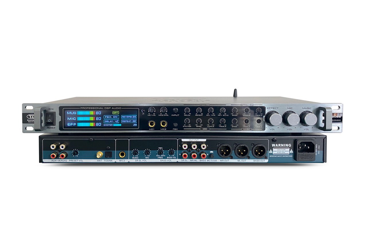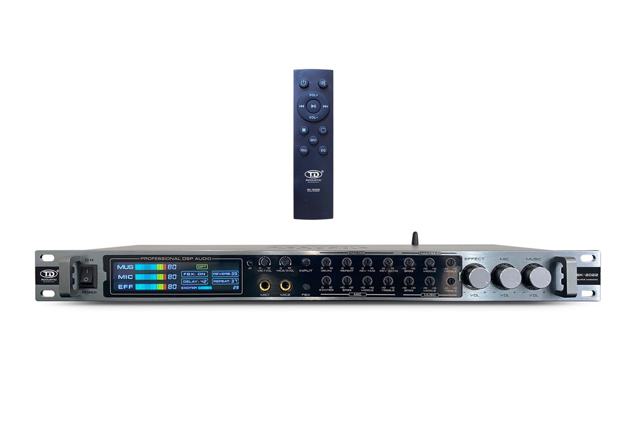 Sản phẩm chất lượng cao cấp và sự khác biệt là phương châm kinh doanh sản xuất của công ty chúng tôi.  Mẫu vang cơ lai số SK-2022 ( Super Karaoke) chính hãng TD Acoustic là một ví dụ điển hình về một sản phẩm nổi bật, khác biệt, sở hữu những tính năng thông minh mà các dòng sản phẩm khác cùng phân khúc giá trên thị trường không có. Chúng tôi luôn lắng  nghe ý kiến của khách hàng để cải tiến chất lượng linh kiện và hiệu ứng âm thanh vượt trội cùng với thiết kế đẹp mắt chắc chắn sẽ là luồng gió mới của thị trường âm thanh Việt Nam       – Nhãn hiệu: TD Acoustic – Model: SK-2022 – Thiết kế: Vang cơ lai số thiết kế mặt phay hợp kim màu ghi đen khỏe khoắn, trang nhã, đẹp mắt. Màn hình Led hiện thị với chất liệu kính Meca lớn, hiện thị sắc nét các thông số. – Các nút tính năng hiện đại, sắp xếp khoa học, được gia công chắc chắn, bền bỉ, dễ dàng điều chỉnh bằng tay theo ý muốn đơn giản, thân thiện – Các cổng tín hiệu input, output được làm bằng đồng, mạ vàng 24K cho chất lượng tiếp xúc tín hiệu chuẩn, sạch. Biến áp bằng đồng độ bền cao, đảm bảo nguồn điện được ổn định, an toàn       – SK-2022 tích hợp thêm Effect EQ ( Echo – Reverb) hay phân khúc, tăng khả năng tinh chỉnh chi tiết hơn các âm sắc, tone Effect đa dạng và linh hoạt hơn – Phân khúc có Effect EQ được hãng nghiên cứu, cải tiến hiệu ứng hay hơn. Reverb mượt mà, uyển chuyển. Echo luyến láy bay bổng, tiếng vang mềm mại, đầy đủ và nổi bật hơn – Tích hợp Cut mic out sub xử lý triệt để tình trạng ù rú ( bass) của Mic trong không gian hẹp, nhỏ – Sub out cut freq ( Min 25 Hz): SK-2022 sẽ cực kỳ hữu ích cho những khách hàng đam mê tiếng sub sâu khỏe ấm áp mà không pha tạp lời như những thiết bị khác cùng phân khúc. – Vỉ chống rú được sử dụng công nghệ chống rú đời mới, giảm thiểu cao khả năng rú rít mà không ảnh hưởng đến chất lượng âm thanh – Khiển Remote tiện lợi: thiết kế nhỏ gọn, dễ dàng sử dụng – Sử dụng công nghệ chip Bluetooth 5.0 không dây tiện lợi cho tốc độ bắt âm thanh xa, chuẩn, hay – Tất cả các linh kiện của IC của vang cơ lai số SK-2022 được nhập khẩu chính hãng các hãng nổi tiếng nước ngoài: USA, Japan, Korea, Taiwan – Sản phẩm được nghiên cứu, gia công tỉ mỉ, sản xuất trên dây chuyền công nghệ cao bởi các kỹ sư có kinh nghiệm lâu năm trong ngành âm thanh – Kích thước: 483 (D) x 182 (R) x 45 (C) (mm) – Khối lượng: 2.9 Kg