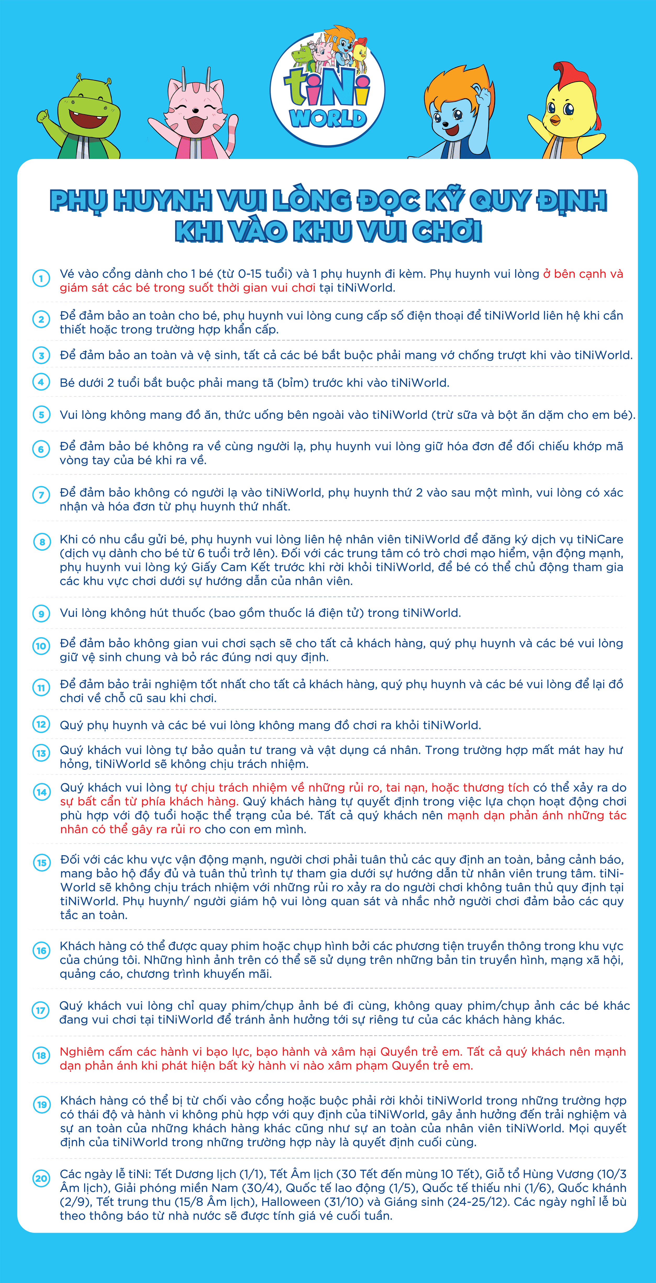 Đến Hệ thống tiNiWorld, các bậc phụ huynh hoàn toàn có thể yên tâm vì con yêu của mình được bảo vệ an toàn nhất. Tất cả các thiết bị đồ chơi tại đây đều